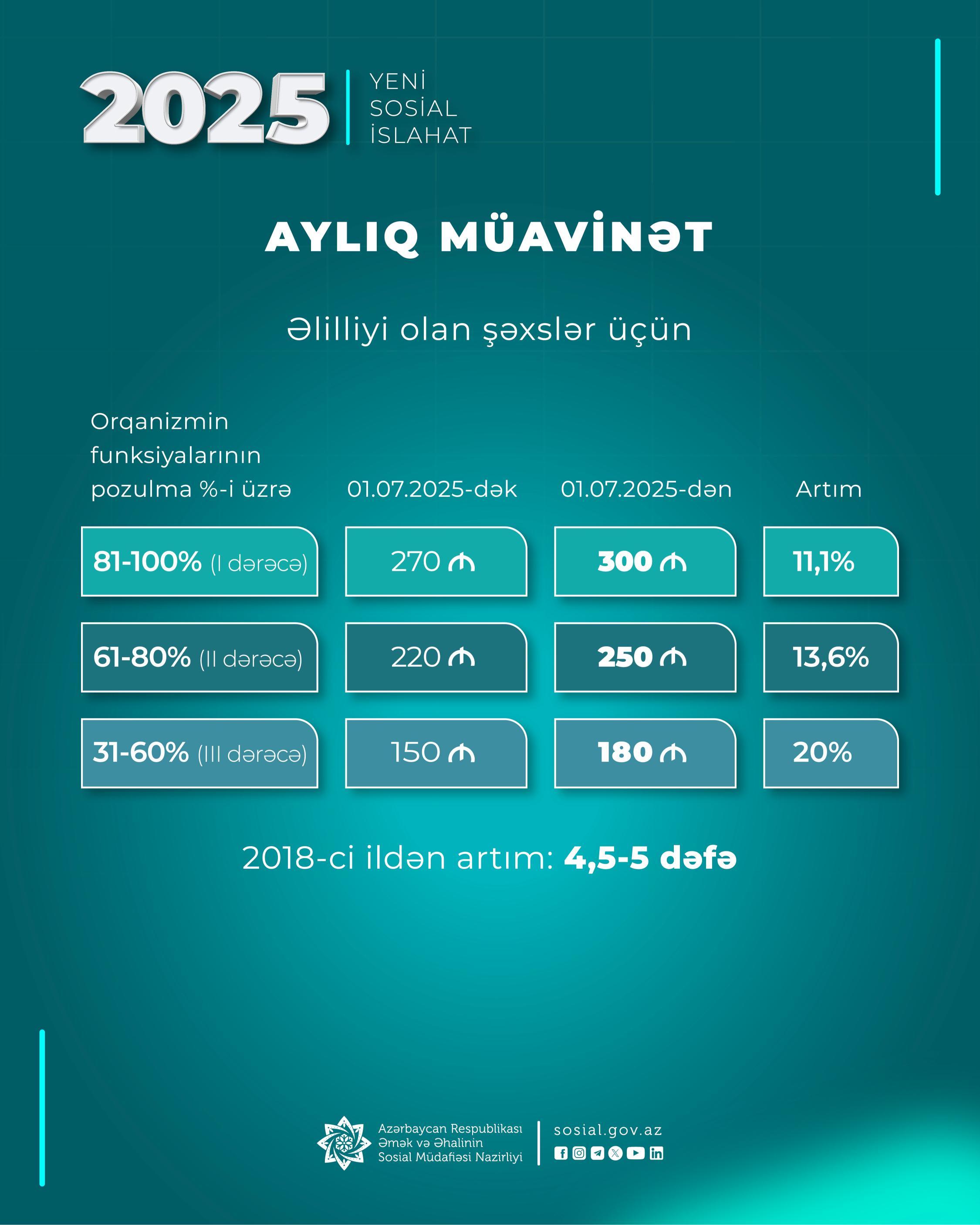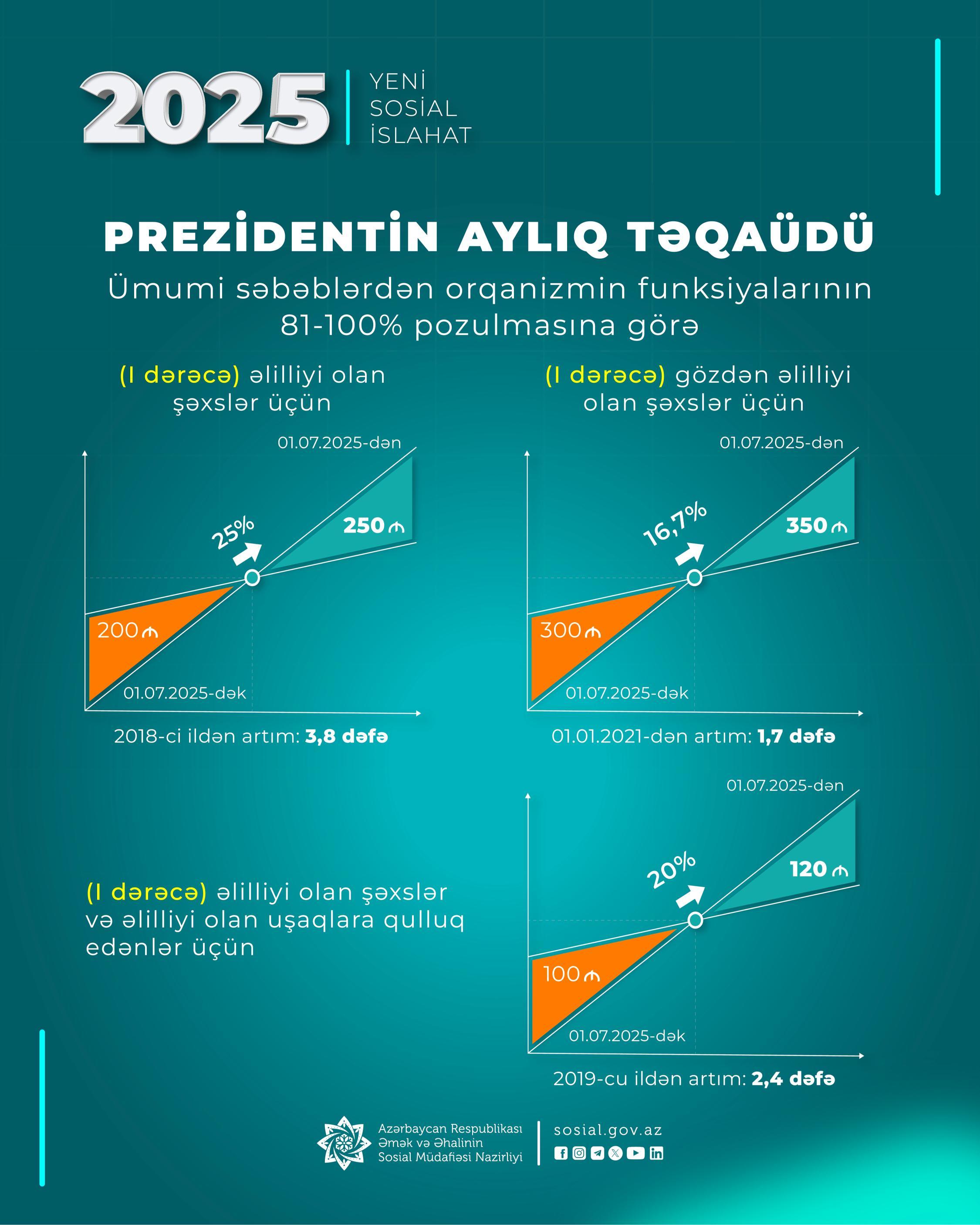 - Orqanizmin funksiyalarının 81-100 faiz pozulmasına görə (I dərəcə) və əlilliyi olan uşaqlara qulluq edənlərə Prezidentin aylıq təqaüdü — 120 manata çatdırılır;