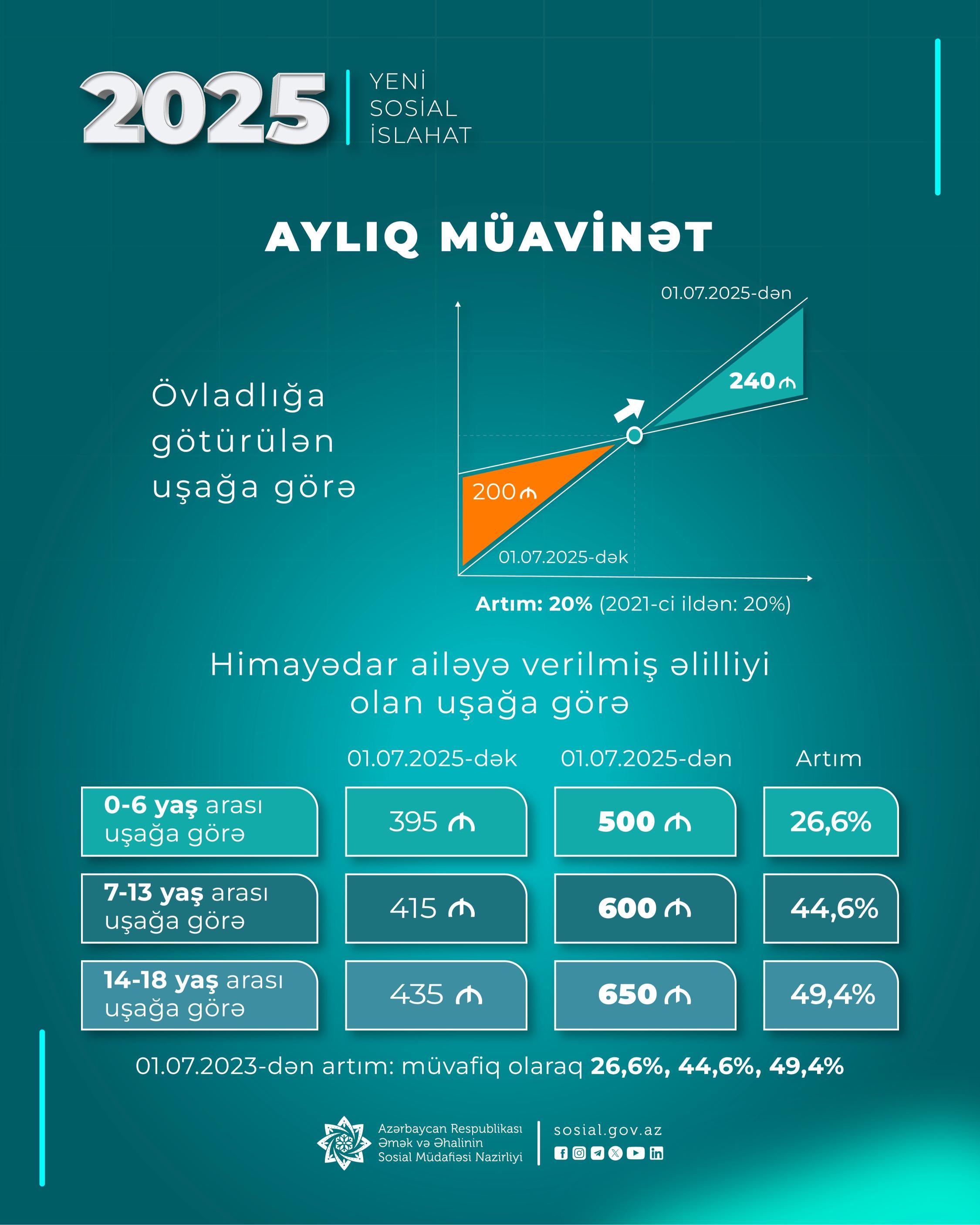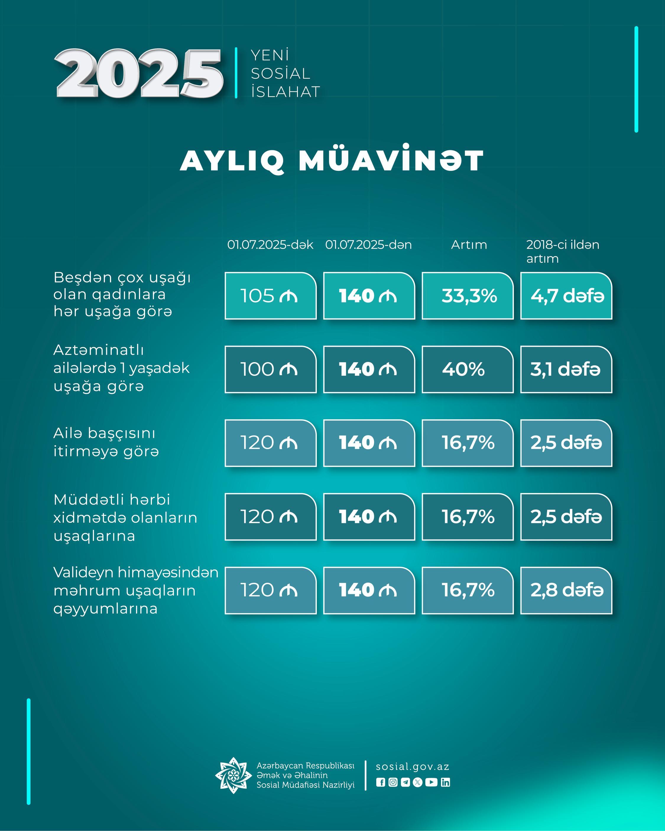 - Bir yaşınadək uşağı olan aztəminatlı ailələrə (ünvanlı yardım alan) hər uşağa görə aylıq müavinət — 140 manata çatdırılır;