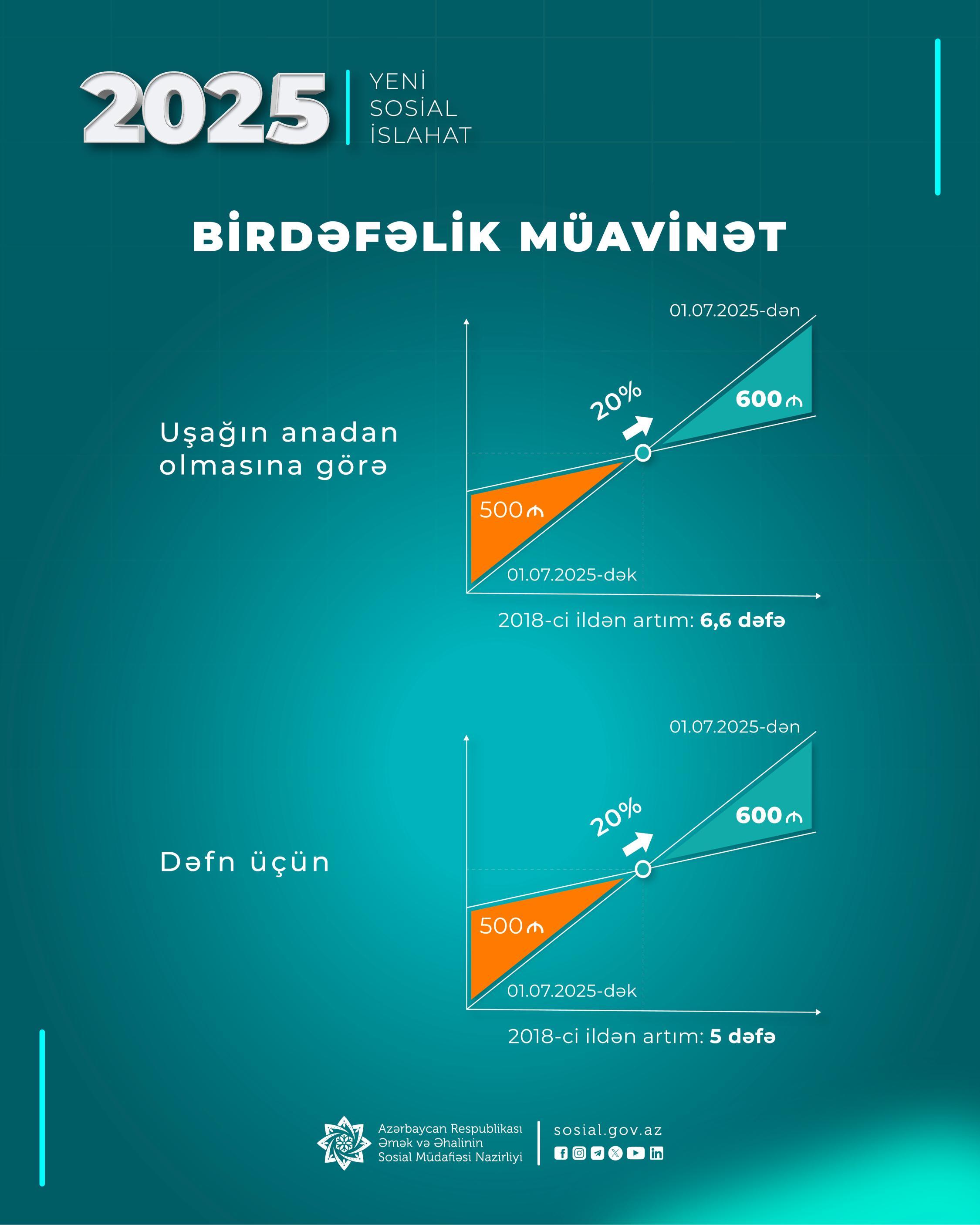 - Uşağın anadan olmasına görə birdəfəlik müavinət — 600 manata çatdırılır;