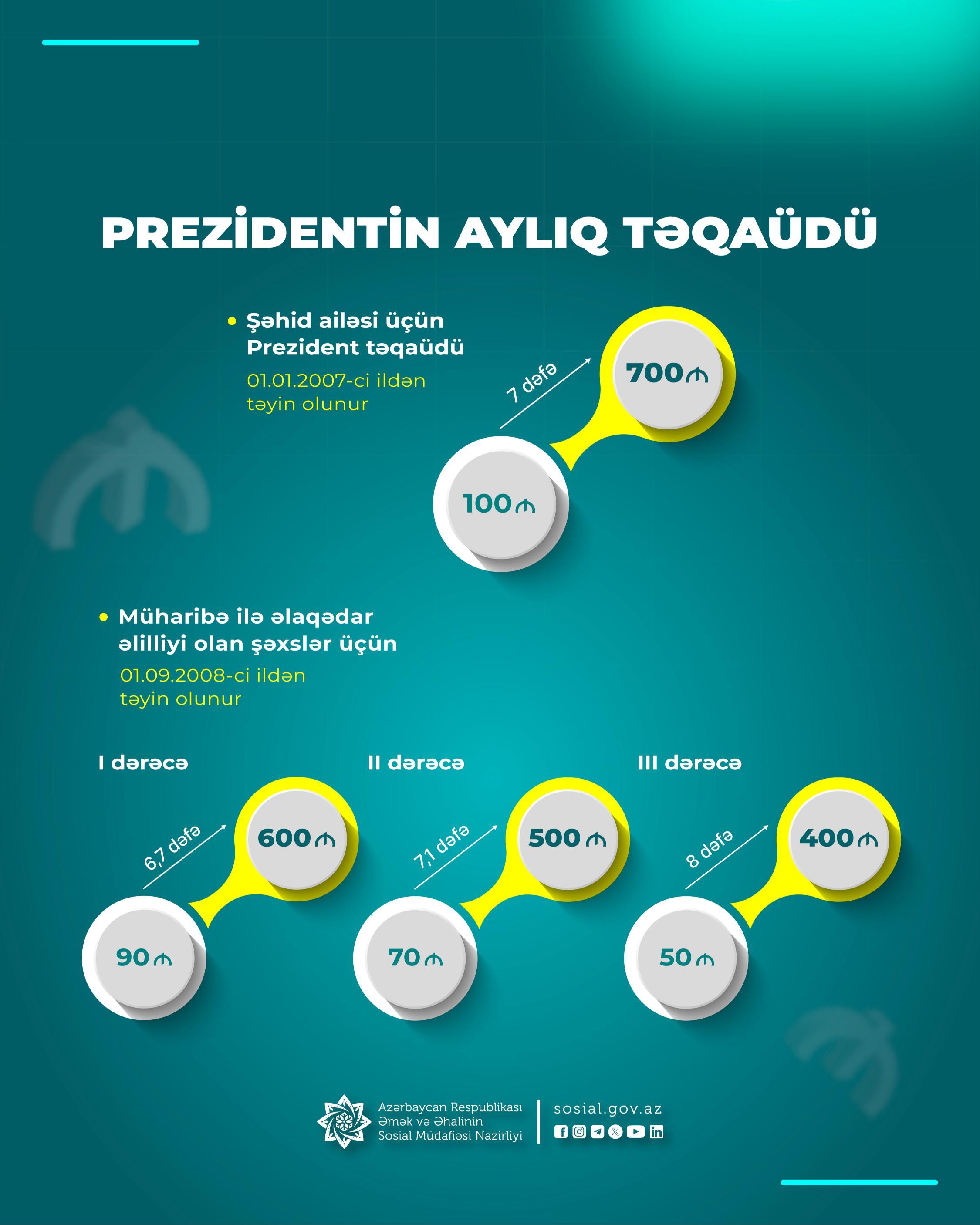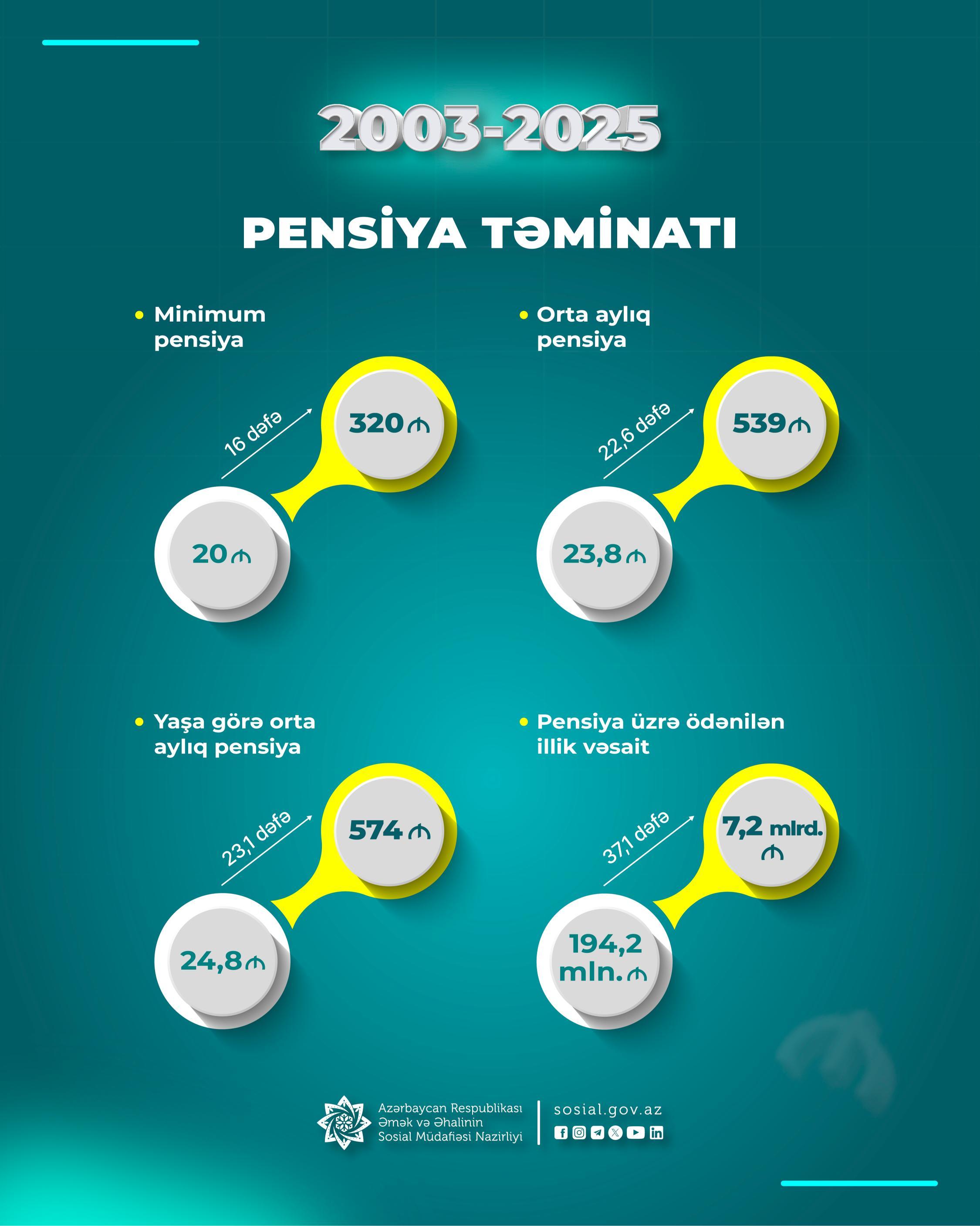 Sosial ödənişlərin artırılması dövlət siyasətinin prioritet istiqamətini təşkil edir və ölkə Prezidentinin imzaladığı Fərman və Sərəncamlarla bu istiqamətdə davamlı addımların atılması təmin edilib. 2003-cü ildən ötən dövrdə minimum aylıq əməkhaqqı 44,4 dəfə artırılaraq 400 manata, minimum aylıq pensiya 16 dəfə artırılaraq 320 manata çatdırılıb. Orta aylıq əməkhaqqı 14,2 dəfə artaraq 77 manatdan 2025-ci ilin 1 sentyabr tarixinə 1093,8 manata, orta aylıq pensiya 22,6 dəfə artaraq 539 manata, yaşa görə orta aylıq pensiya 23,1 dəfə artaraq 574 manata çatıb.