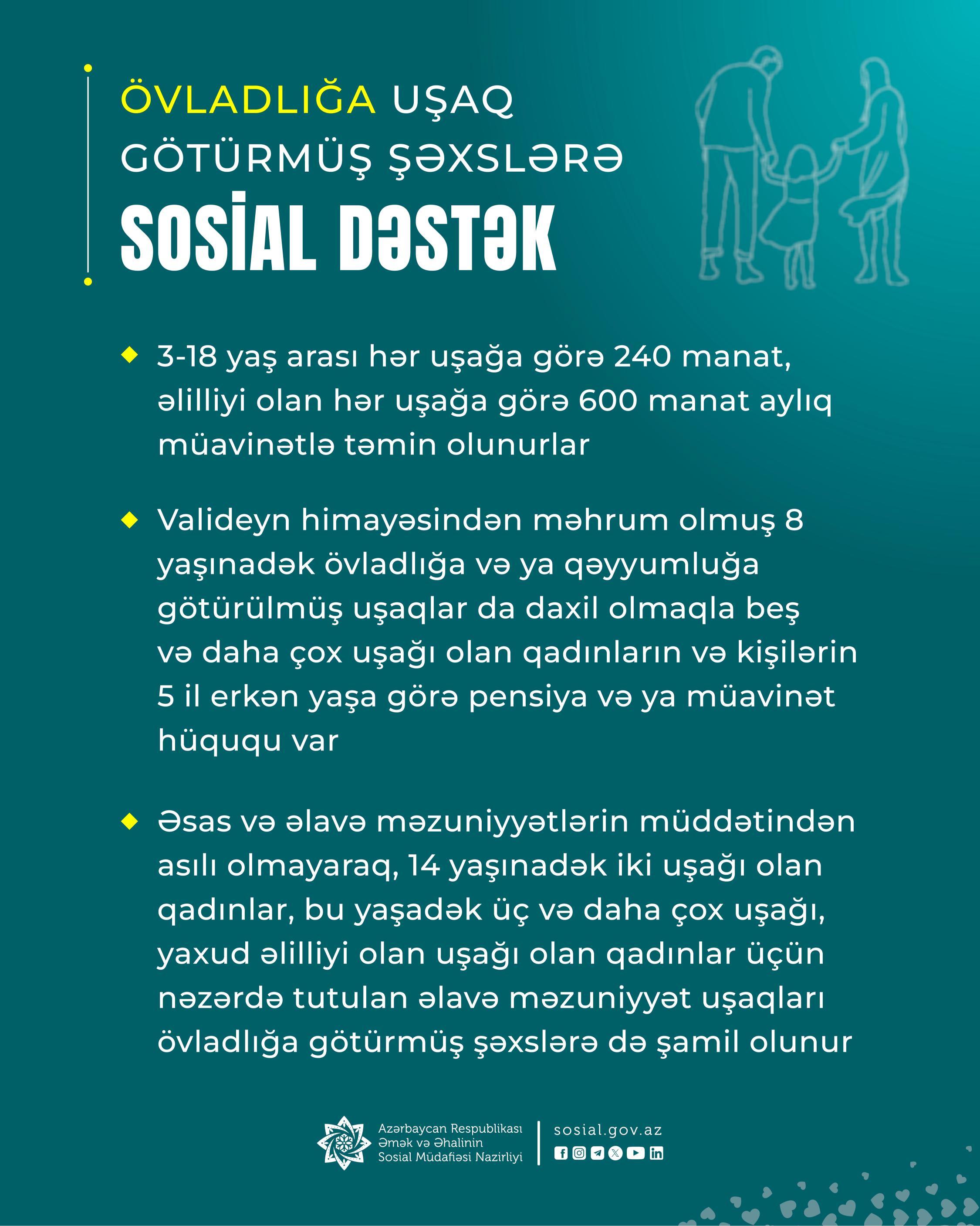 Övladlığa uşaq götürmüş şəxslər aylıq sosial müavinətlə (3-18 yaş arası hər uşağa görə 240 manat, əlilliyi olan hər uşağa görə 600 manat) təmin edilməklə yanaşı, onlar sosial təminat, əmək, vergi münasibətləri sahələrində bir sıra güzəştlərə də malikdirlər.