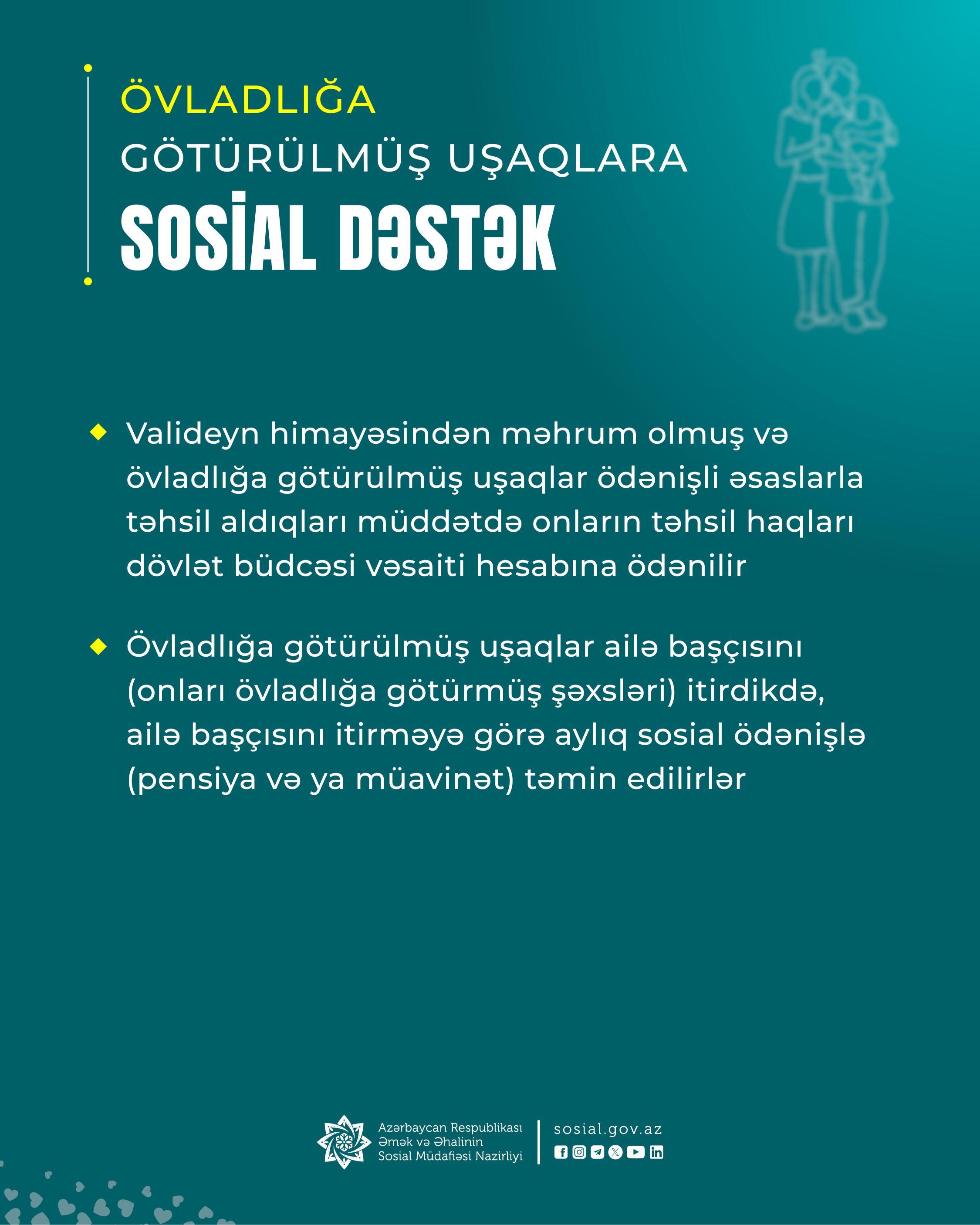 Eyni zamanda övladlığa götürülmüş uşaqlar ailə başçısını (onları övladlığa götürmüş şəxsləri) itirdikdə, ailə başçısını itirməyə görə aylıq sosial ödənişlə (pensiya və ya müavinət) təmin edilirlər. Habelə valideyn himayəsindən məhrum olmuş və övladlığa götürülmüş uşaqlar ödənişli əsaslarla təhsil aldıqları müddətdə onların təhsil haqları dövlət büdcəsi vəsaiti hesabına ödənilir;