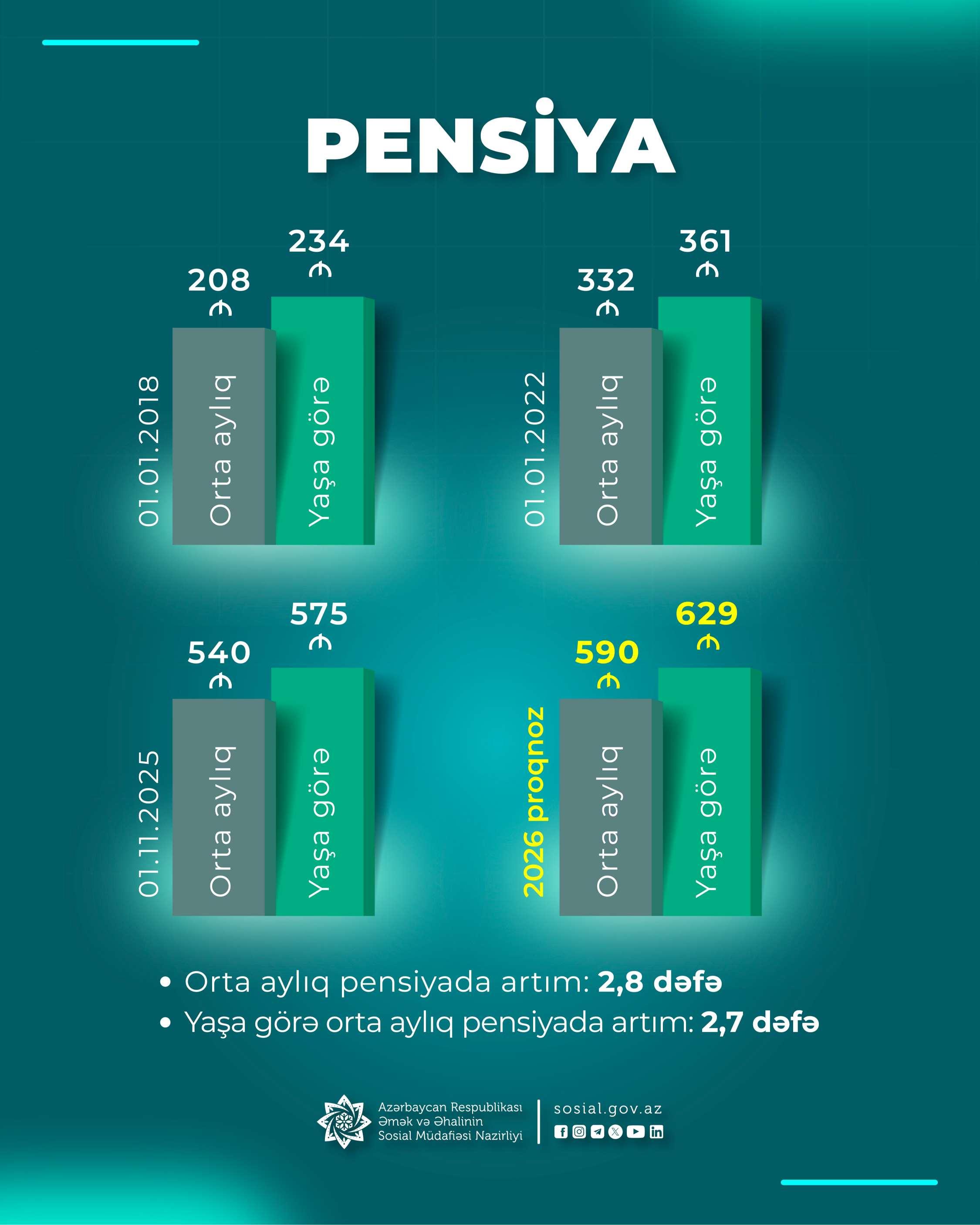 2018-2025-ci illərdə orta aylıq pensiya 208 manatdan 540 manata, yaşa görə orta aylıq pensiya 234 manatdan 575 manata çatıb. Növbəti ildə isə müvafiq olaraq 590 manata və 629 manata çatacağı gözlənilir.