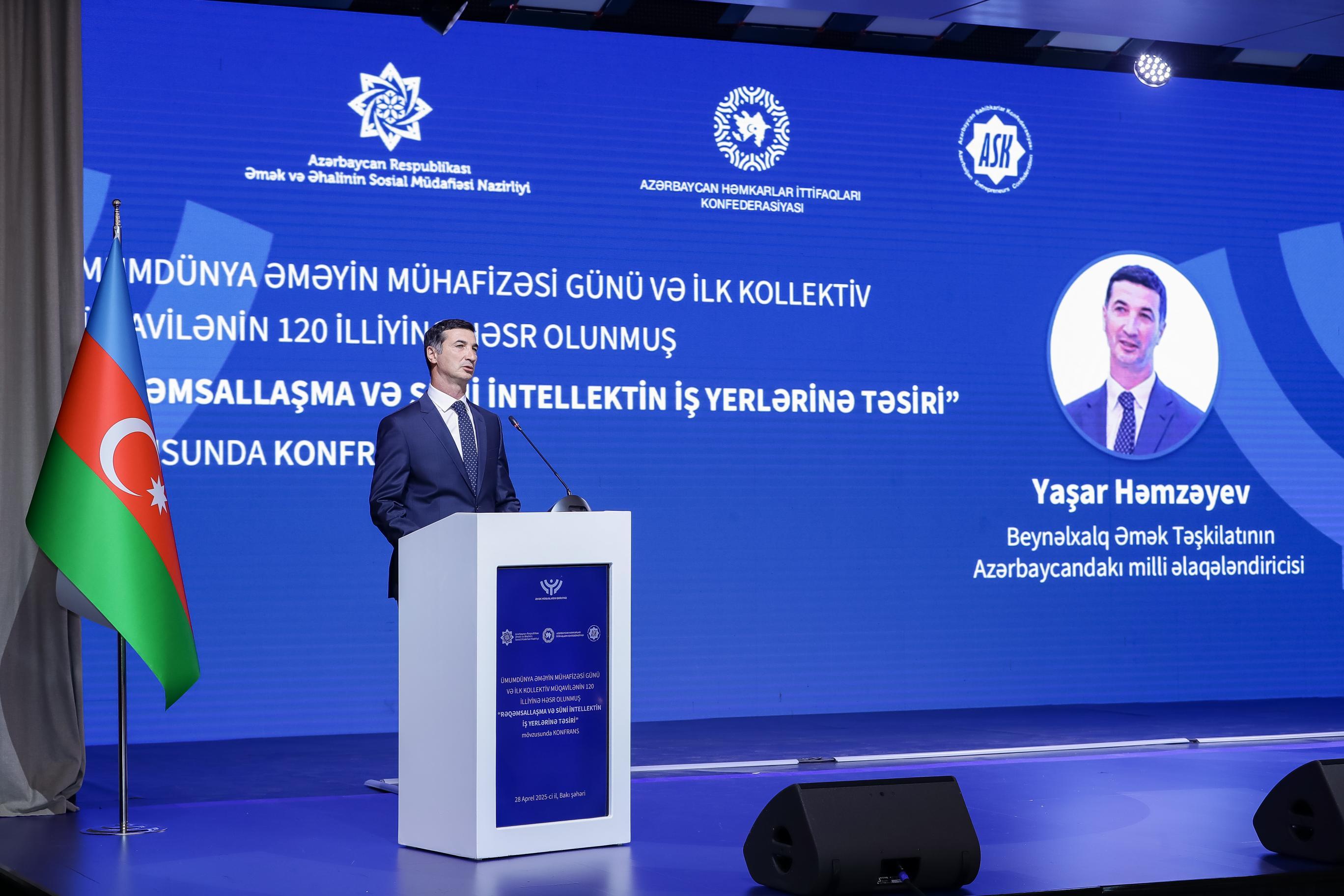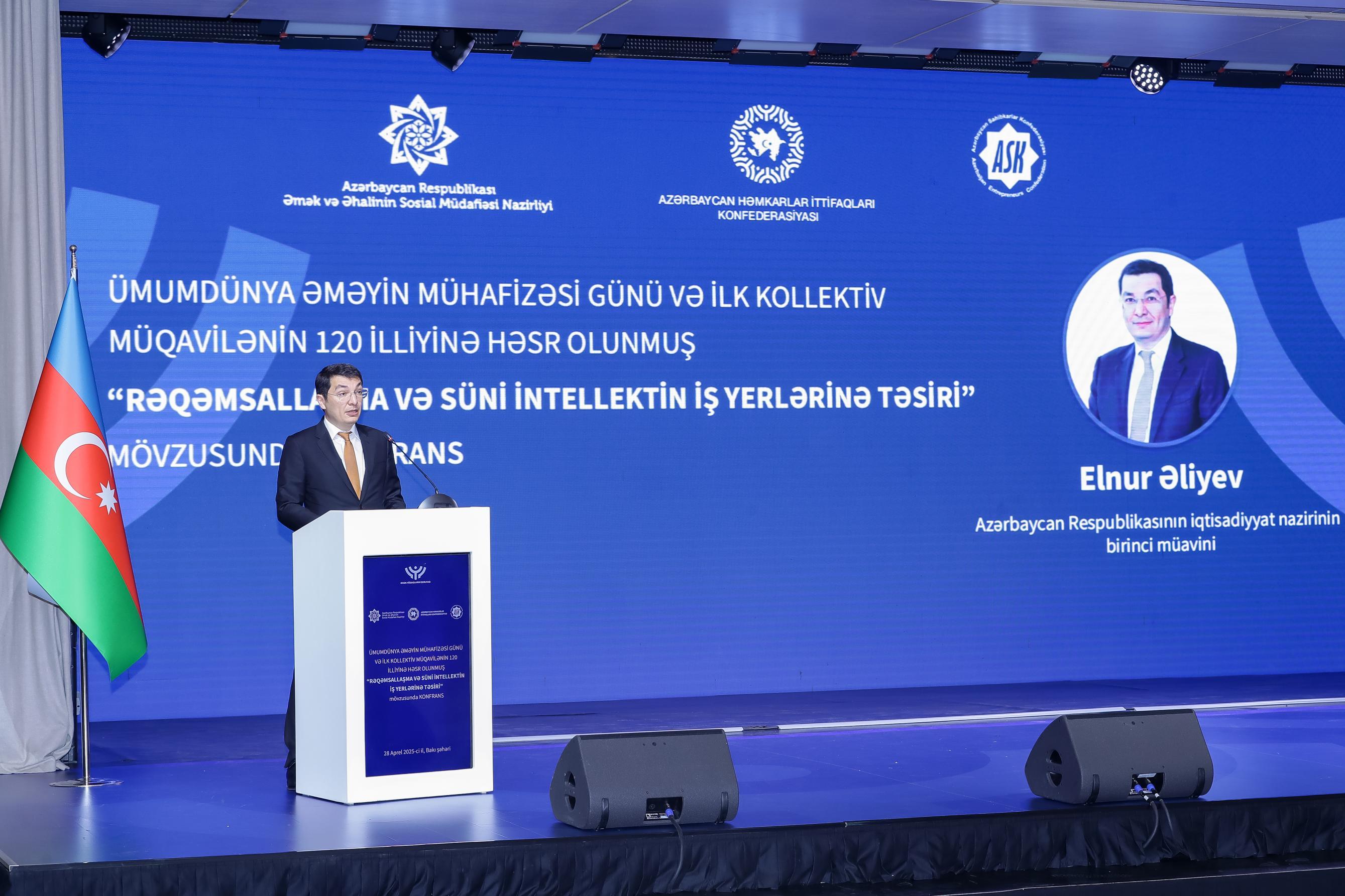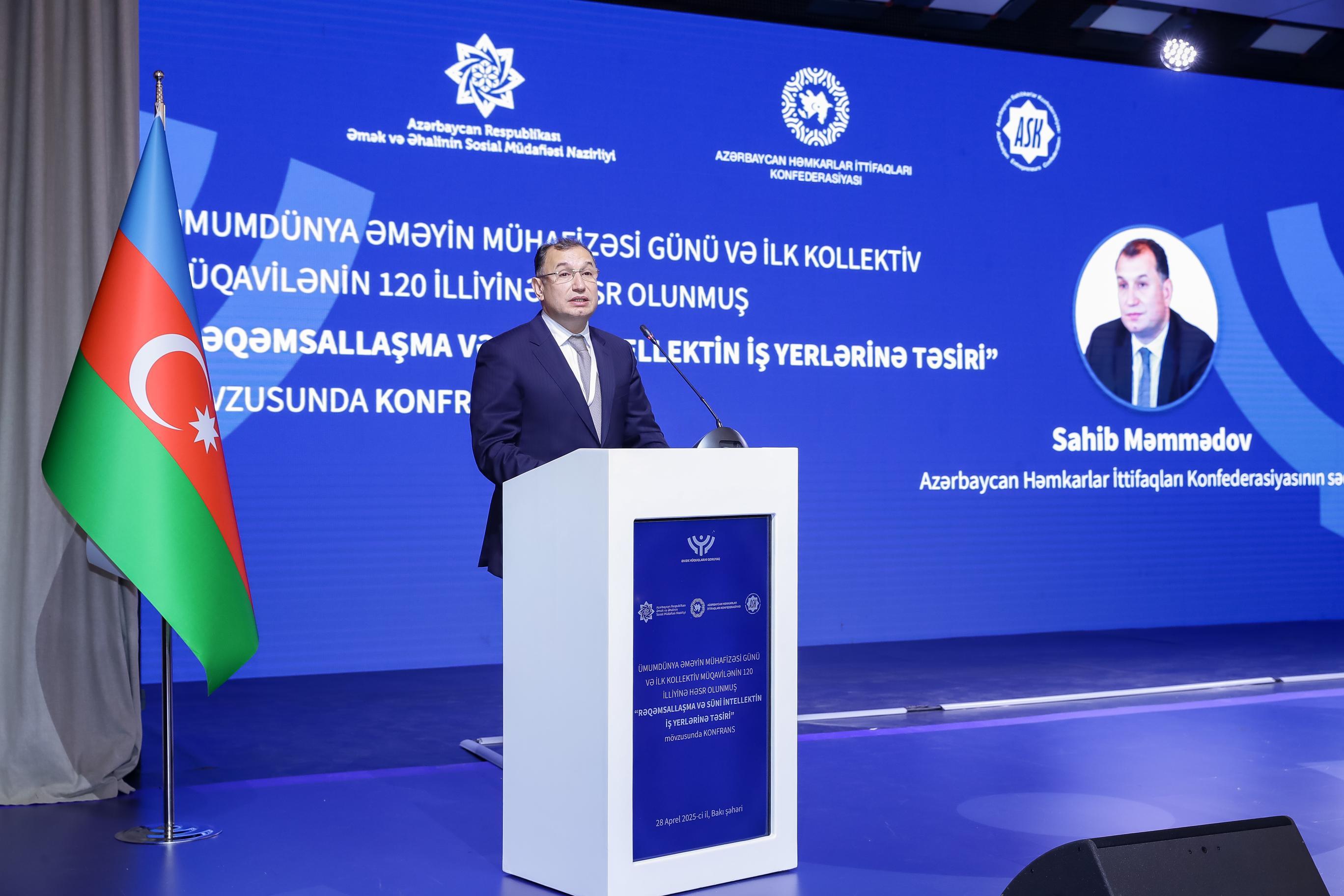 Əmək və Əhalinin Sosial Müdafiəsi Nazirliyi, Azərbaycan Həmkarlar İttifaqları Konfederasiyası (AHİK) və Azərbaycan Respublikası Sahibkarlar (İşəgötürənlər) Təşkilatları Milli Konfederasiyasının (ASK) birgə təşkilatçılığı ilə 28 Aprel – Ümumdünya Əməyin Mühafizəsi Günü və ilk kollektiv müqavilənin 120 illiyinə həsr olunmuş “Rəqəmsallaşma və süni intellektin iş yerlərinə təsiri” mövzusunda konfrans keçirilib. Tədbirdə dövlət və özəl qurumların, beynəlxalq təşkilatların nümayəndələri, həmçinin həmkarlar ittifaqlarının üzvləri iştirak ediblər.