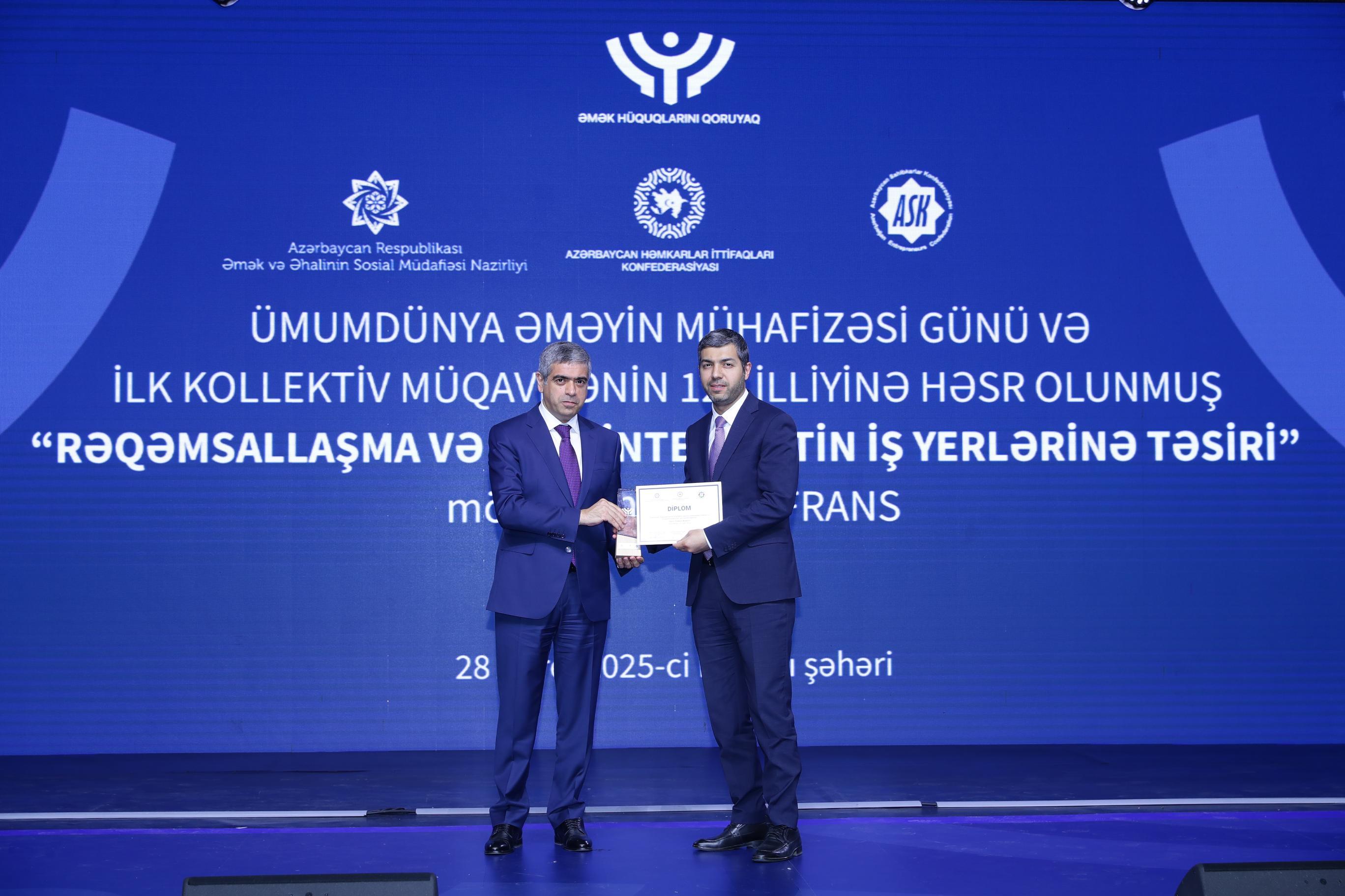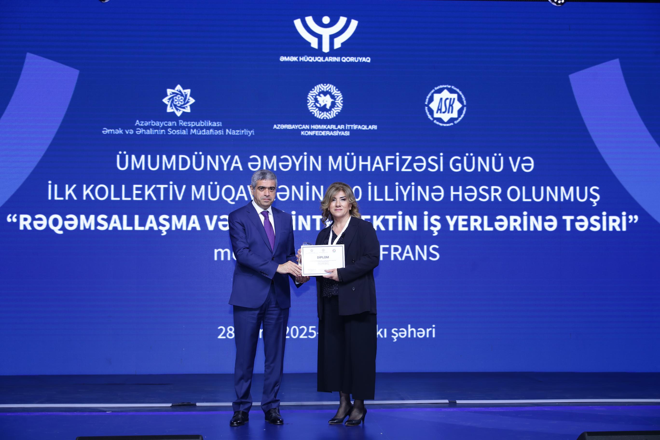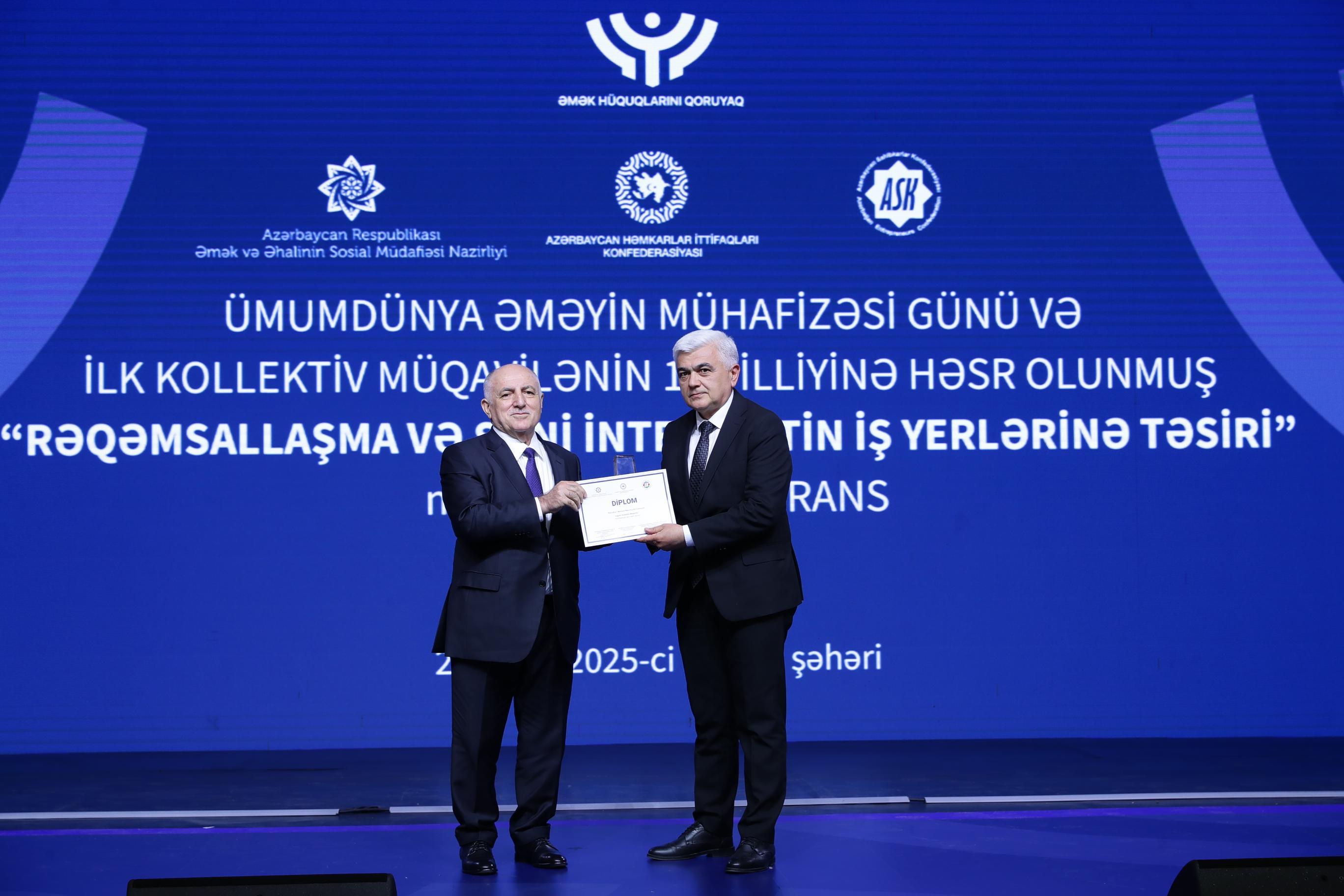 Əmək və Əhalinin Sosial Müdafiəsi Nazirliyi, Azərbaycan Həmkarlar İttifaqları Konfederasiyası (AHİK) və Azərbaycan Respublikası Sahibkarlar (İşəgötürənlər) Təşkilatları Milli Konfederasiyasının (ASK) birgə təşkilatçılığı ilə 28 Aprel – Ümumdünya Əməyin Mühafizəsi Günü və ilk kollektiv müqavilənin 120 illiyinə həsr olunmuş “Rəqəmsallaşma və süni intellektin iş yerlərinə təsiri” mövzusunda konfrans keçirilib. Tədbirdə dövlət və özəl qurumların, beynəlxalq təşkilatların nümayəndələri, həmçinin həmkarlar ittifaqlarının üzvləri iştirak ediblər.