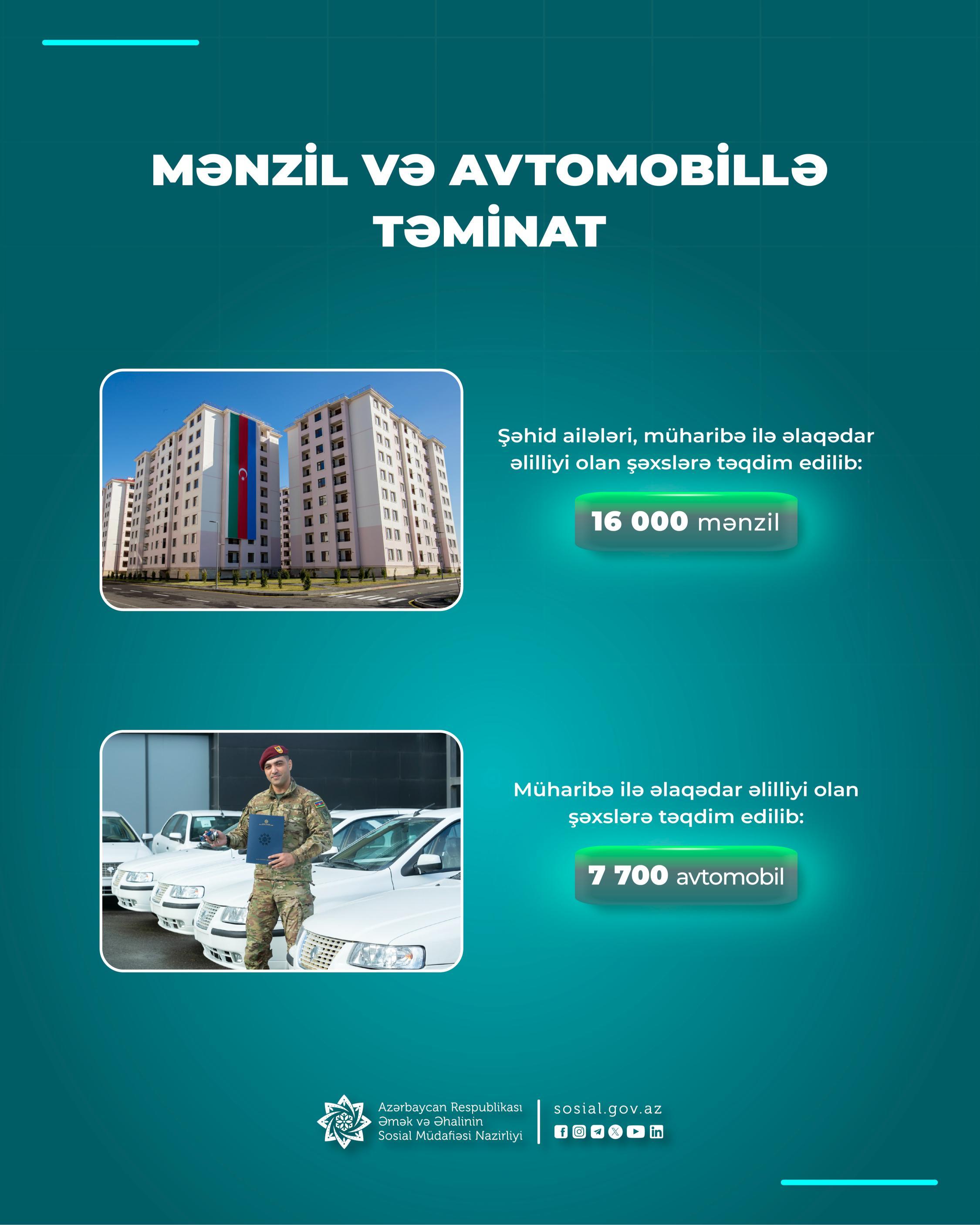 Müharibə ilə əlaqədar əlilliyi olanlara yönələn dəstək tədbirlərindən biri də onların minik avtomobilləri ilə təmin edilməsidir. Bu kateqoriyadan olan vətəndaşlara ötən dövrdə 7700, o cümlədən postmüharibə dövründə 567 avtomobil verilib və növbədə olanların avtomobillə təminatı başa çatıb.