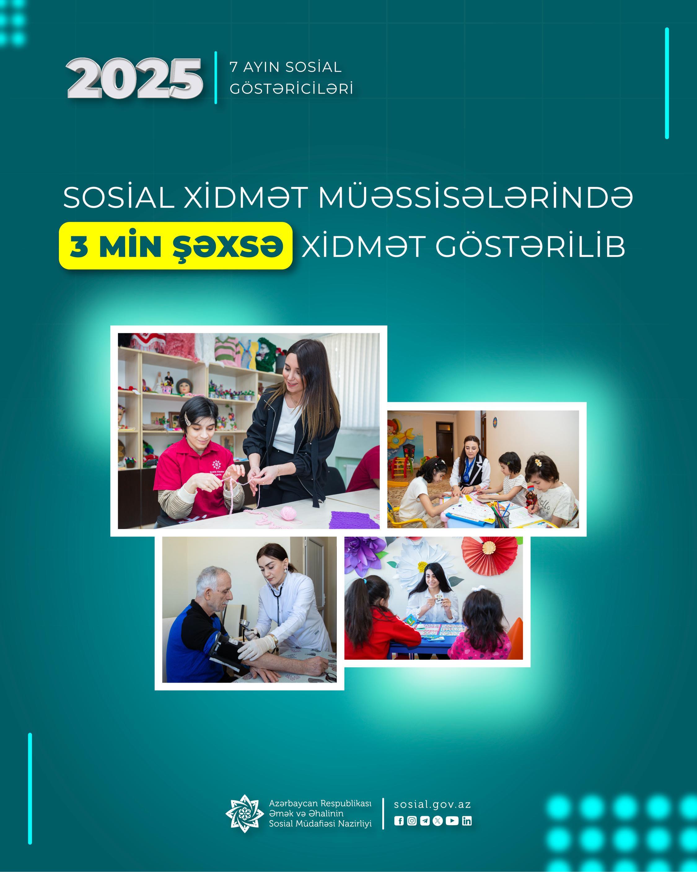 Əmək və Əhalinin Sosial Müdafiə Nazirliyinin tabeliyində Sosial Xidmətlər Agentliyinin 21 sosial xidmət müəssisəsində bu ilin yanvar-iyul aylarında 3 min şəxsə stasionar və yarımstasionar şəraitdə xidmətlər göstərilib.