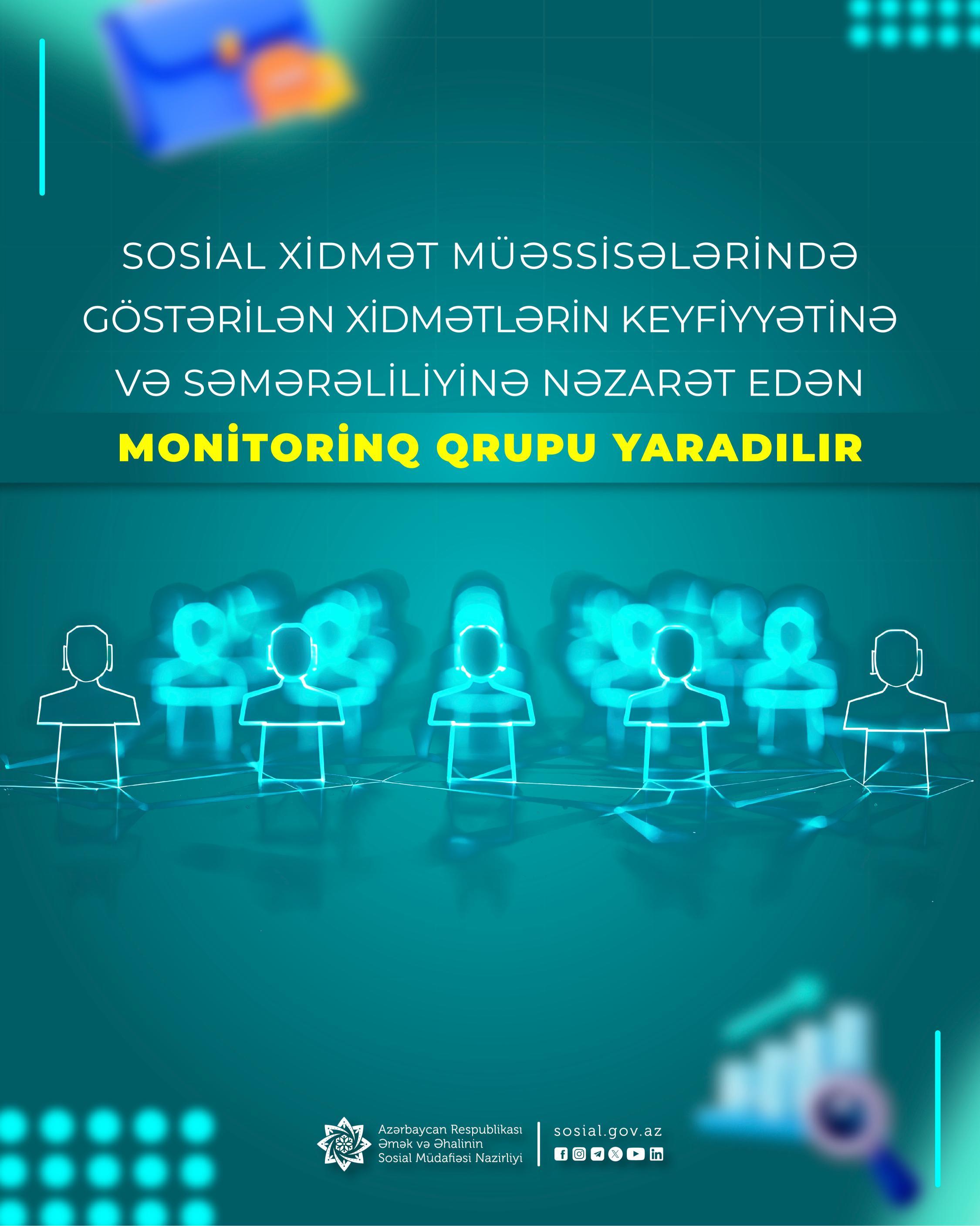 Nazirlər Kabinetinin təsdiq etdiyi yeni “Sosial xidmət müəssisələrində göstərilən xidmətlərin keyfiyyətinə və səmərəliliyinə nəzarətin həyata keçirilməsi Qaydası”na əsasən qeyd edilən istiqamətdə nəzarətin həyata keçirilməsi üçün Əmək və Əhalinin Sosial Müdafiəsi Nazirliyi tərəfindən Monitorinq qrupu yaradılacaq.