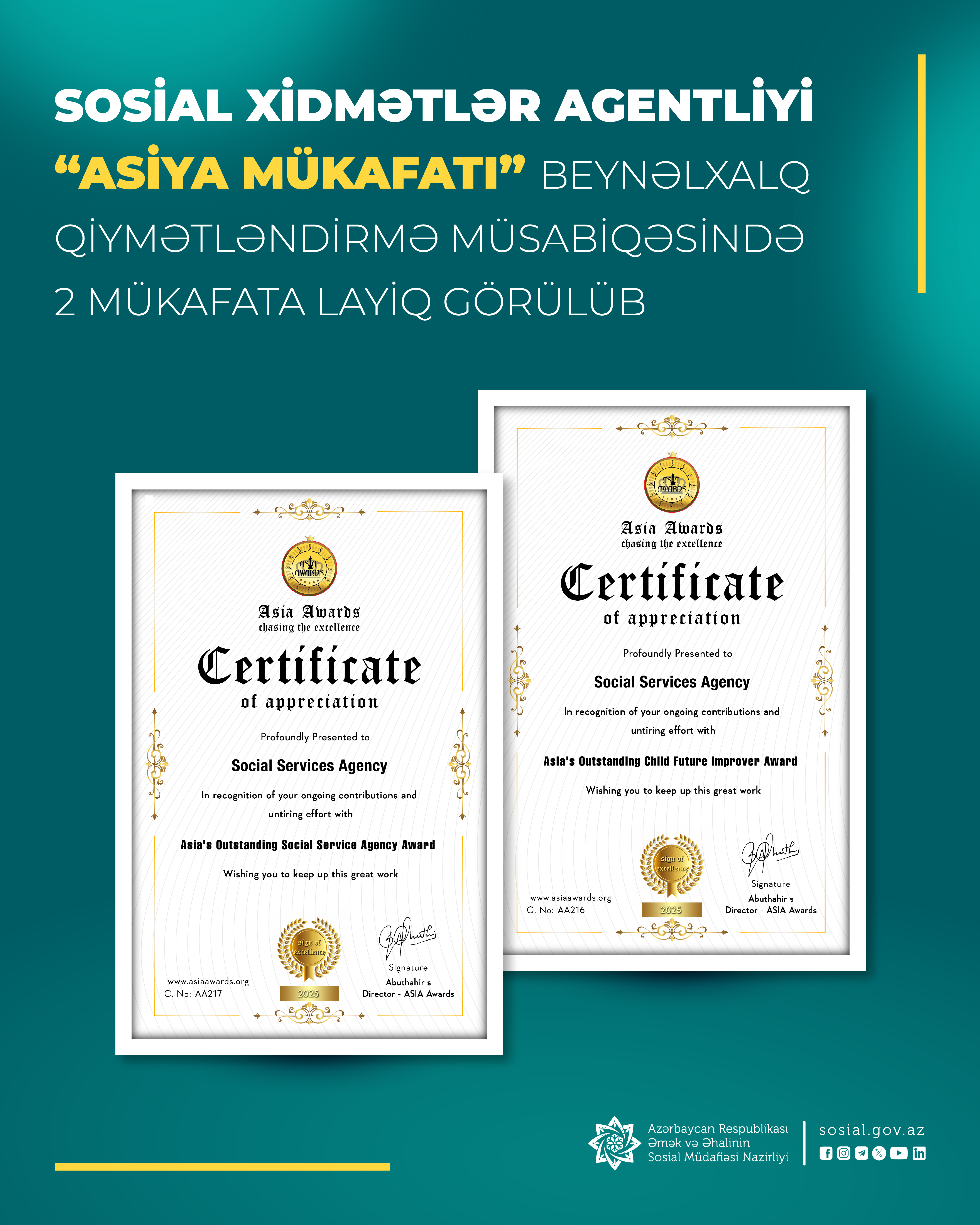 Əmək və Əhalinin Sosial Müdafiəsi Nazirliyinin tabeliyində Sosial Xidmətlər Agentliyi Asiya-Sakit Okean regionu üzrə keçirilən nüfuzlu “Asiya Mükafatı” beynəlxalq qiymətləndirmə müsabiqəsində iki mükafata layiq görülüb.
