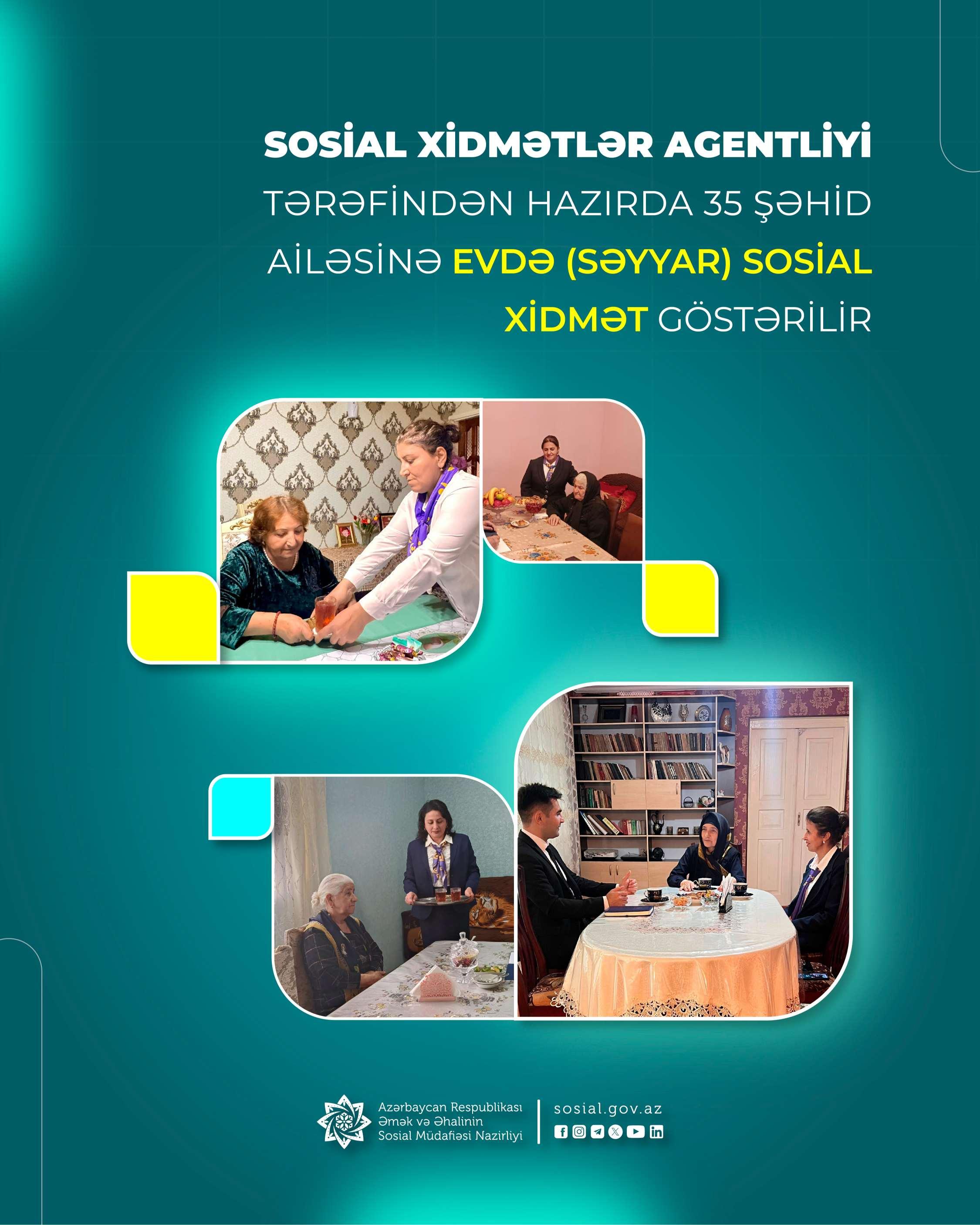 Əmək və Əhalinin Sosial Müdafiəsi Nazirliyinin tabeliyində Sosial Xidmətlər Agentliyinin yerli filialları tərəfindən 35 şəhid ailəsi evdə (səyyar) sosial-məişət xidməti ilə təmin olunur.