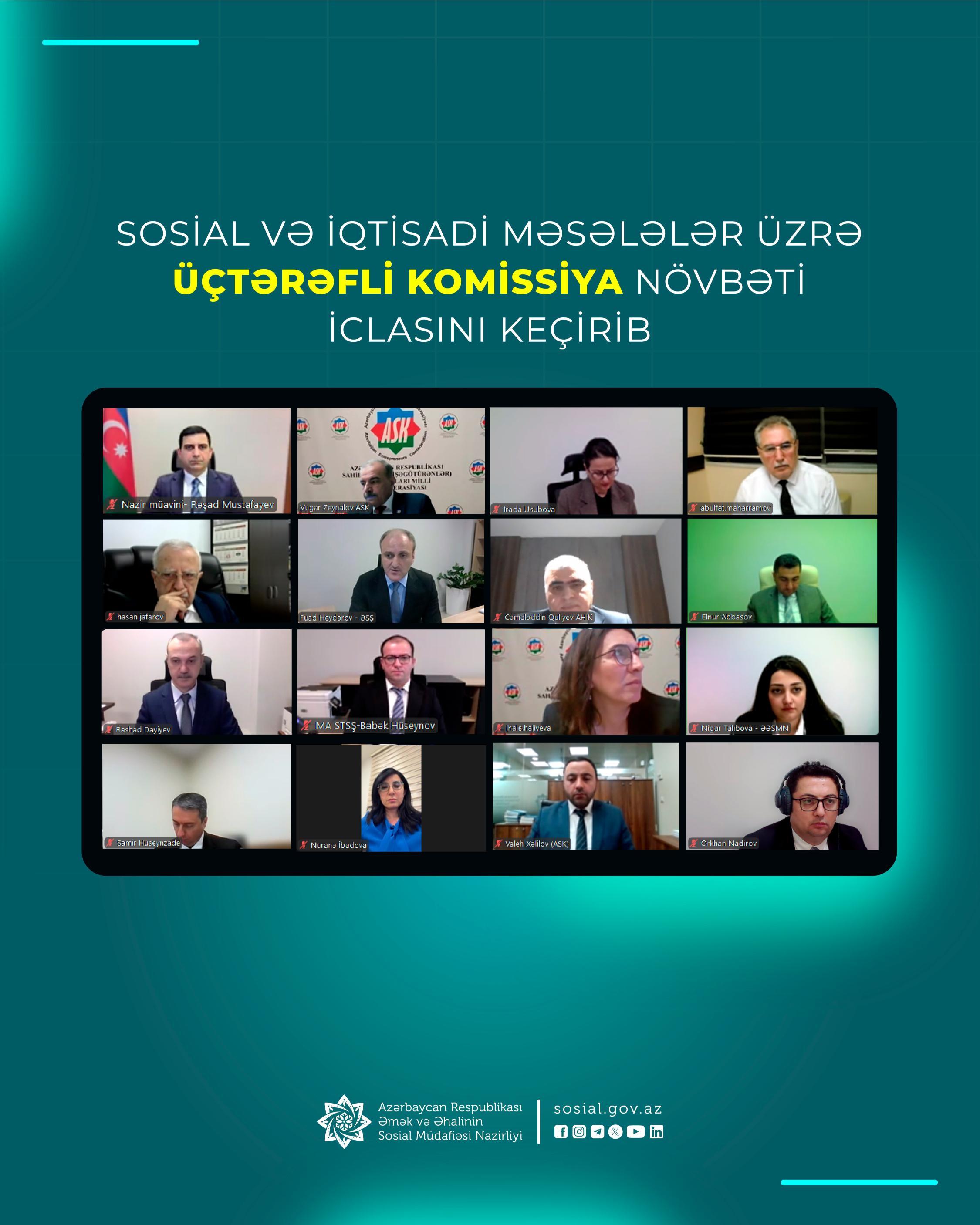 Əmək və Əhalinin Sosial Müdafiəsi Nazirliyi, Azərbaycan Respublikası Sahibkarlar (İşəgötürənlər) Təşkilatları Milli Konfederasiyası (ASK) və Azərbaycan Həmkarlar İttifaqları Konfederasiyasının (AHİK) təmsil olunduğu Sosial və İqtisadi məsələlər üzrə Üçtərəfli Komissiyanın növbəti iclası keçirilib.