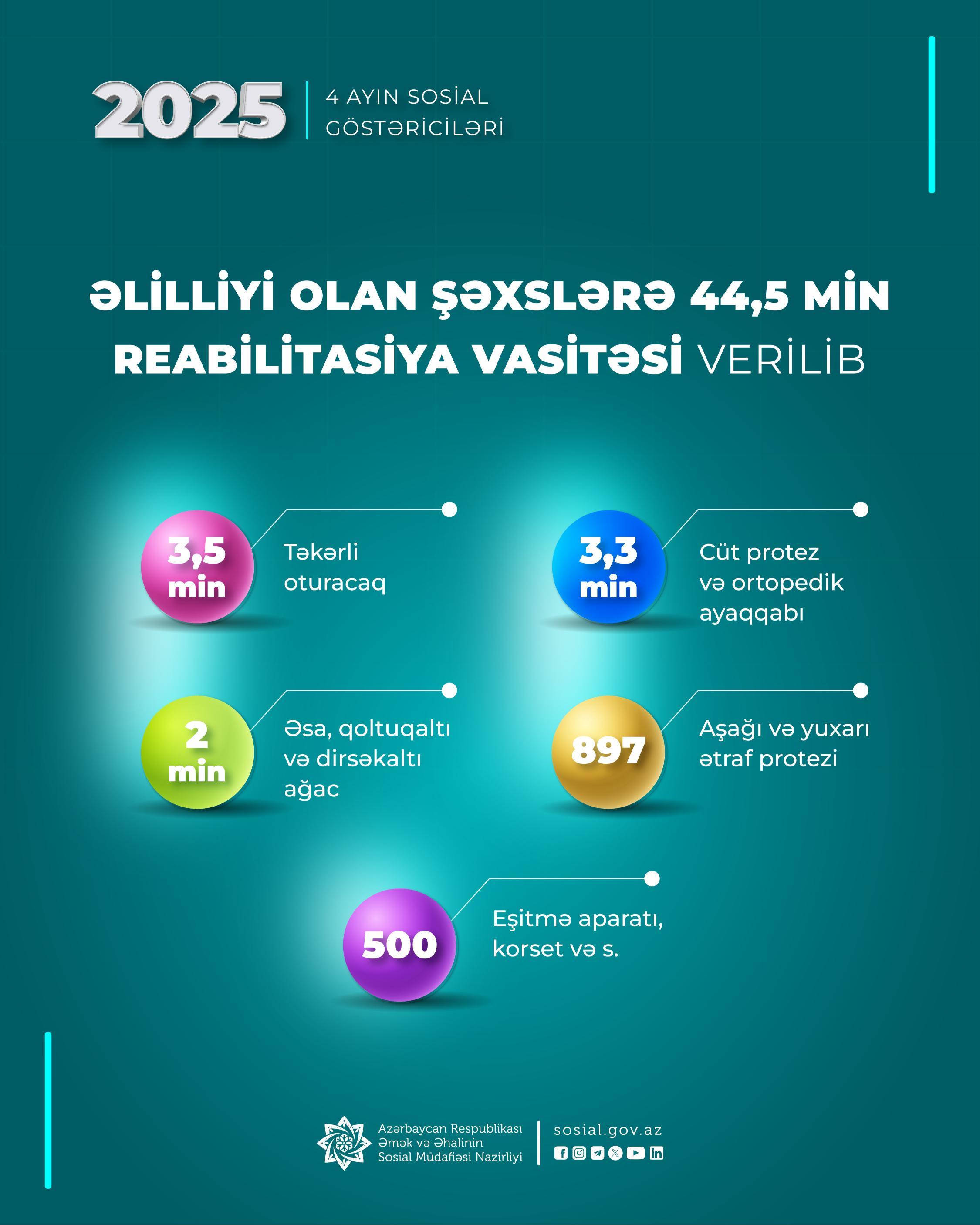 Həmçinin əlilliyi olan şəxslərə 3,3 min cüt protez və ortopedik ayaqqabı, 500-dən çox eşitmə aparatı, korset və s. reabilitasiya vasitələri təqdim olunub.