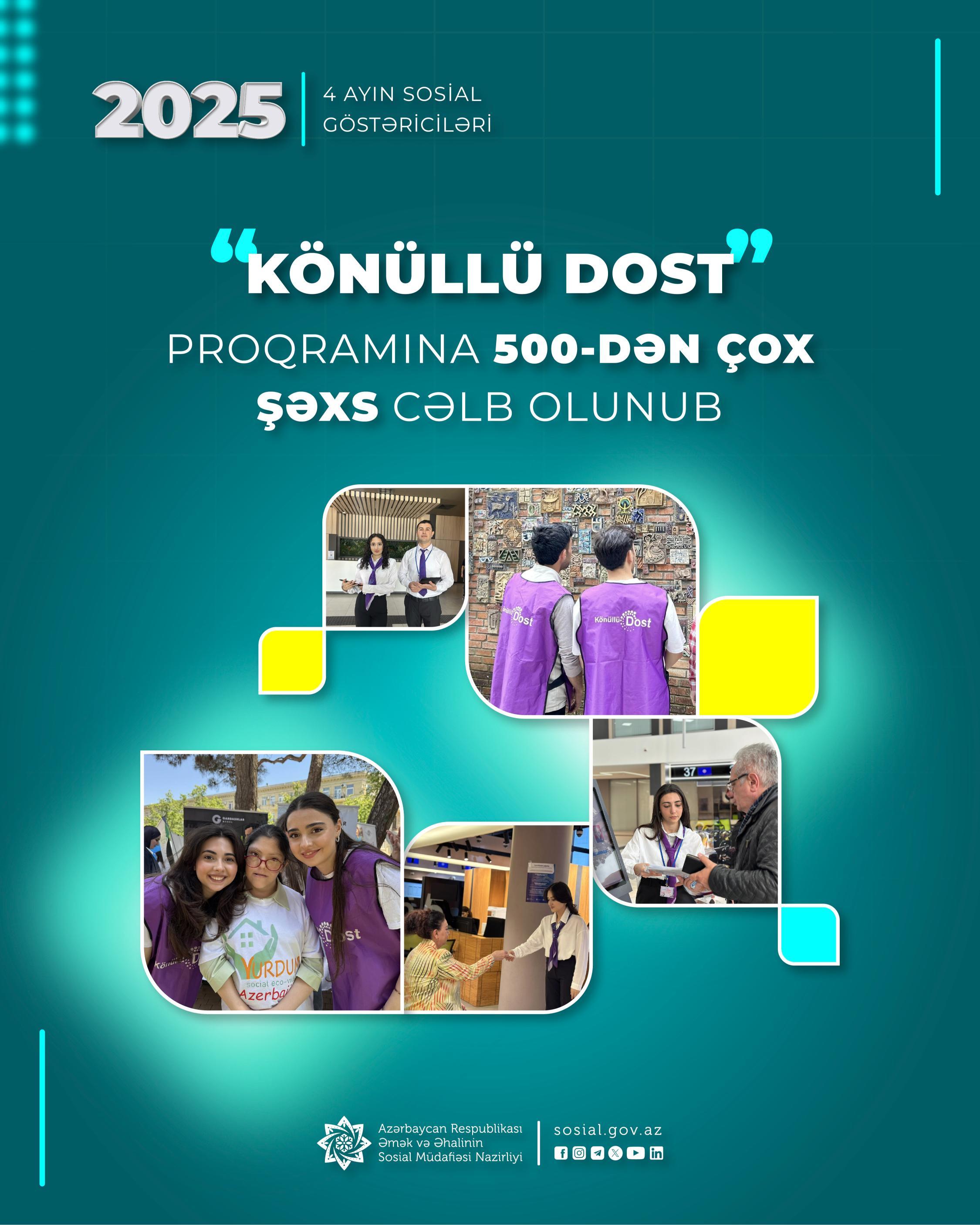 Azərbaycanda könüllülük hərəkatının genişlənməsində mühüm rola malik “Könüllü DOST” proqramına cari ilin 4 ayı ərzində 11,4 min müraciət olub, 523 şəxs proqrama cəlb olunub.
