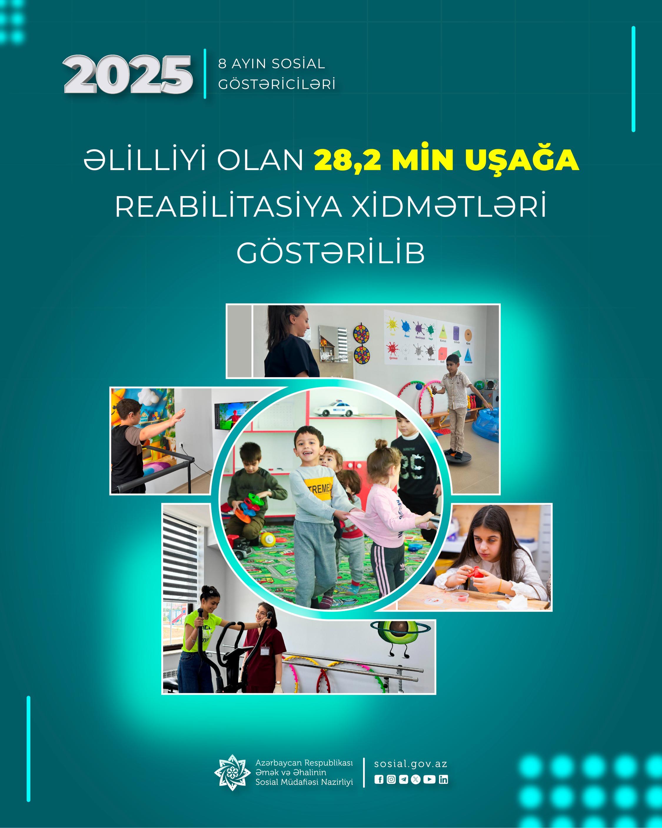 Əmək və Əhalinin Sosial Müdafiəsi Nazirliyinin tabeliyində Dövlət Tibbi-Sosial Ekspertiza və Reabilitasiya Agentliyinin uşaq reabilitasiya mərkəzlərində bu ilin yanvar-avqust aylarında əlilliyi olan 28,2 min uşağa xidmətlər göstərilib.