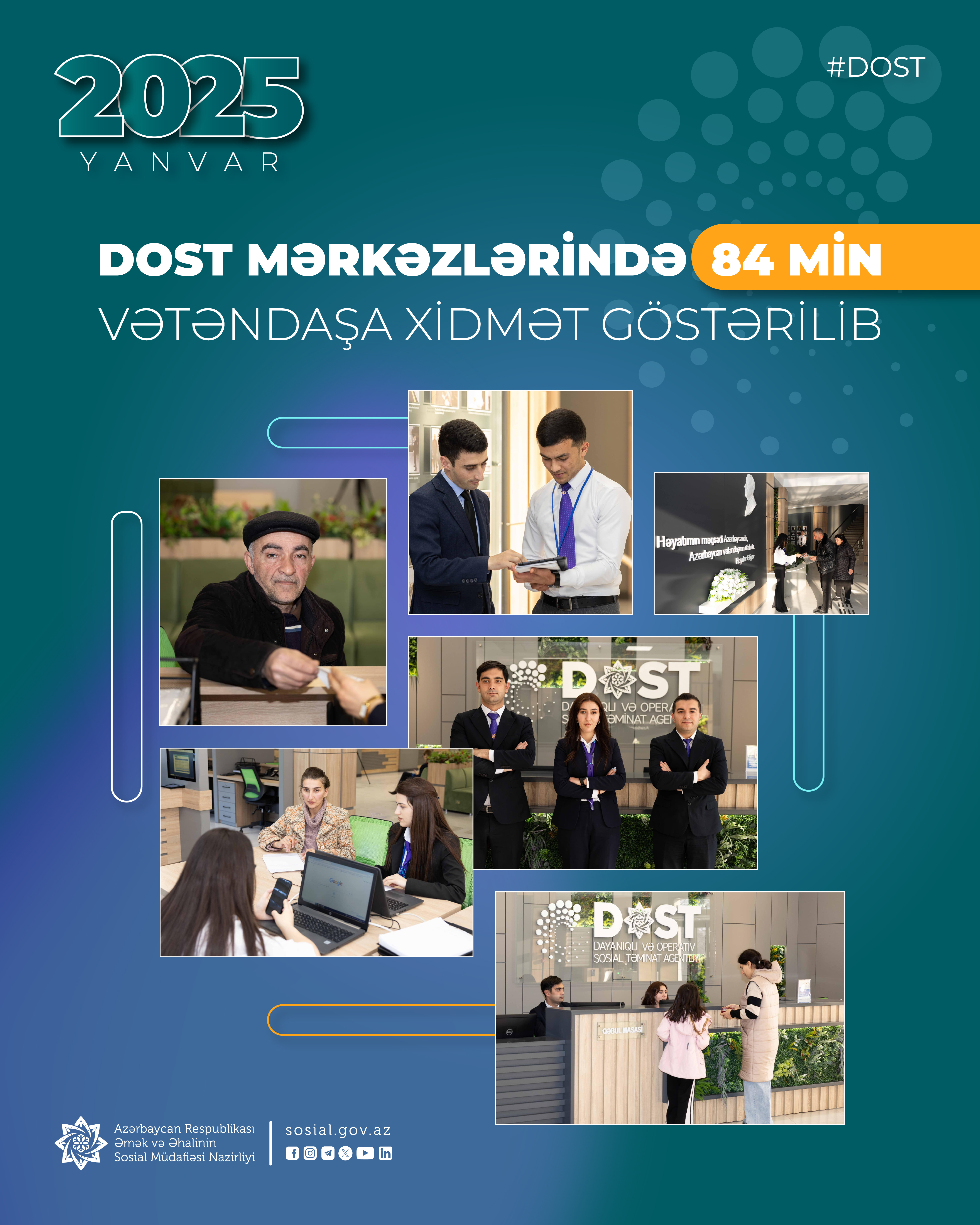 2019-cu ilin may ayından ölkəmizdə artıq 7 DOST mərkəzi açılıb. Həmin mərkəzlərdə 160 sosial xidmət “bir pəncərə”dən, müasir və çevik, şəffaf mexanizmlərlə, vətəndaş məmnunluğuna uyğun təqdim edilir.