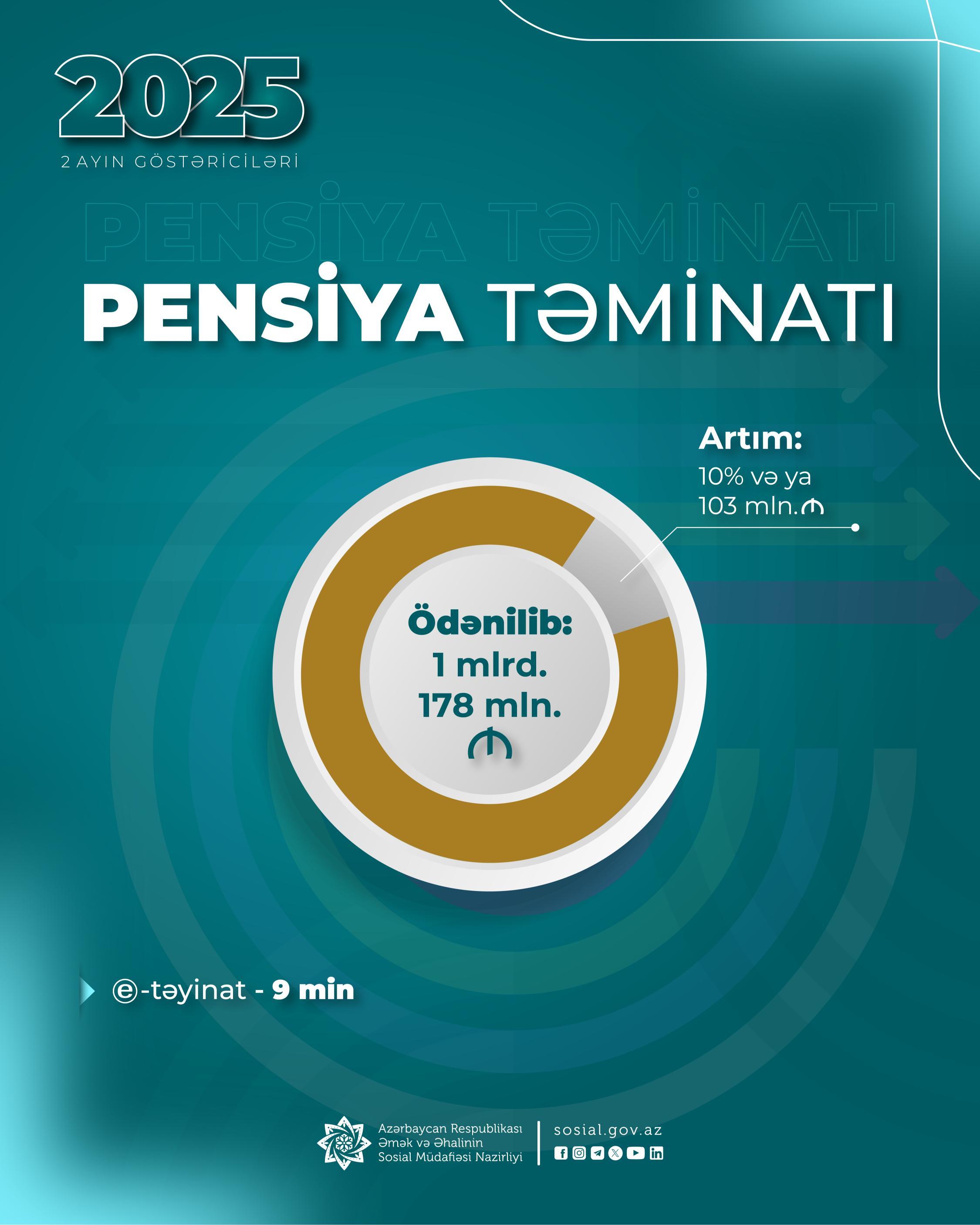 Cari ilin yanvar-fevral aylarında pensiya ödənişlərinə ötən ilin müvafiq dövrünə nisbətən 10 faiz (103 mln. manat) çox olmaqla 1 mlrd. 178 mln. manat vəsait yönəldilib.