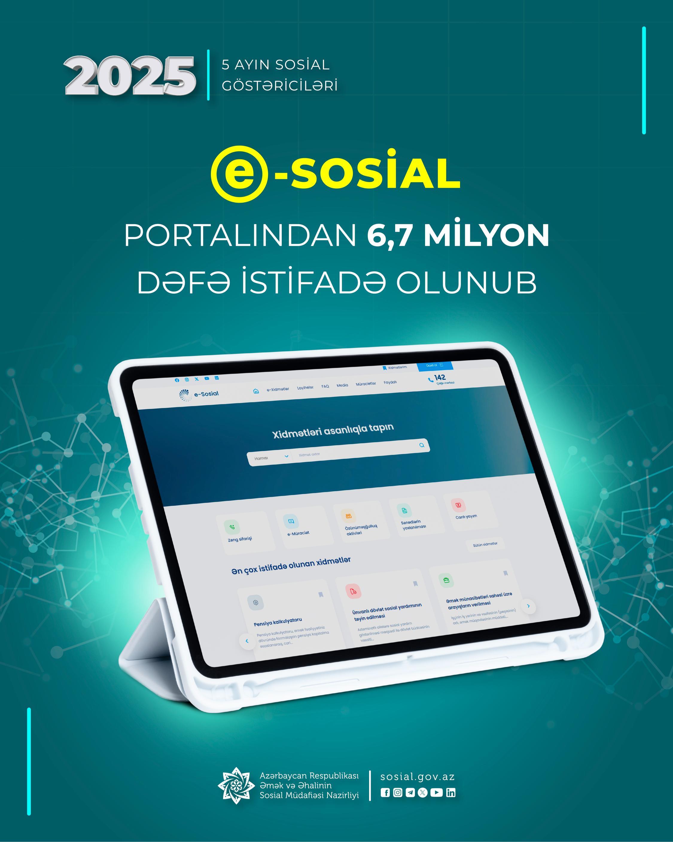 Əmək və Əhalinin Sosial Müdafiəsi Nazirliyinin “e-sosial” internet portalında qeydiyyatdan keçən aktiv istifadəçilərin sayı 2 milyon 461 minə çatıb.