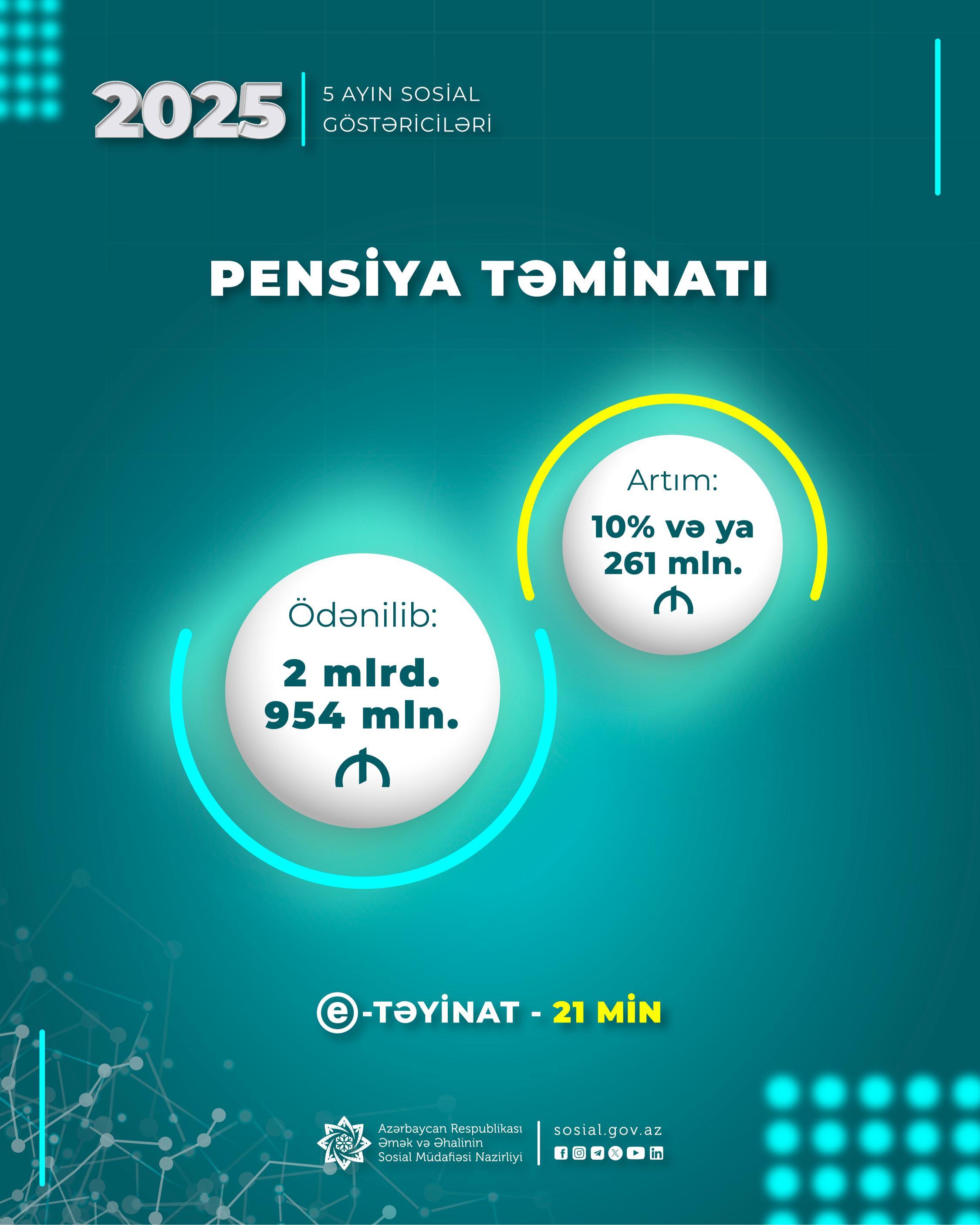 Cari ilin 5 ayında pensiya ödənişlərinə ötən ilin müvafiq dövrünə nisbətən 10 faiz (261 mln. manat) çox olmaqla 2 mlrd. 954 mln. manat vəsait yönəldilib.