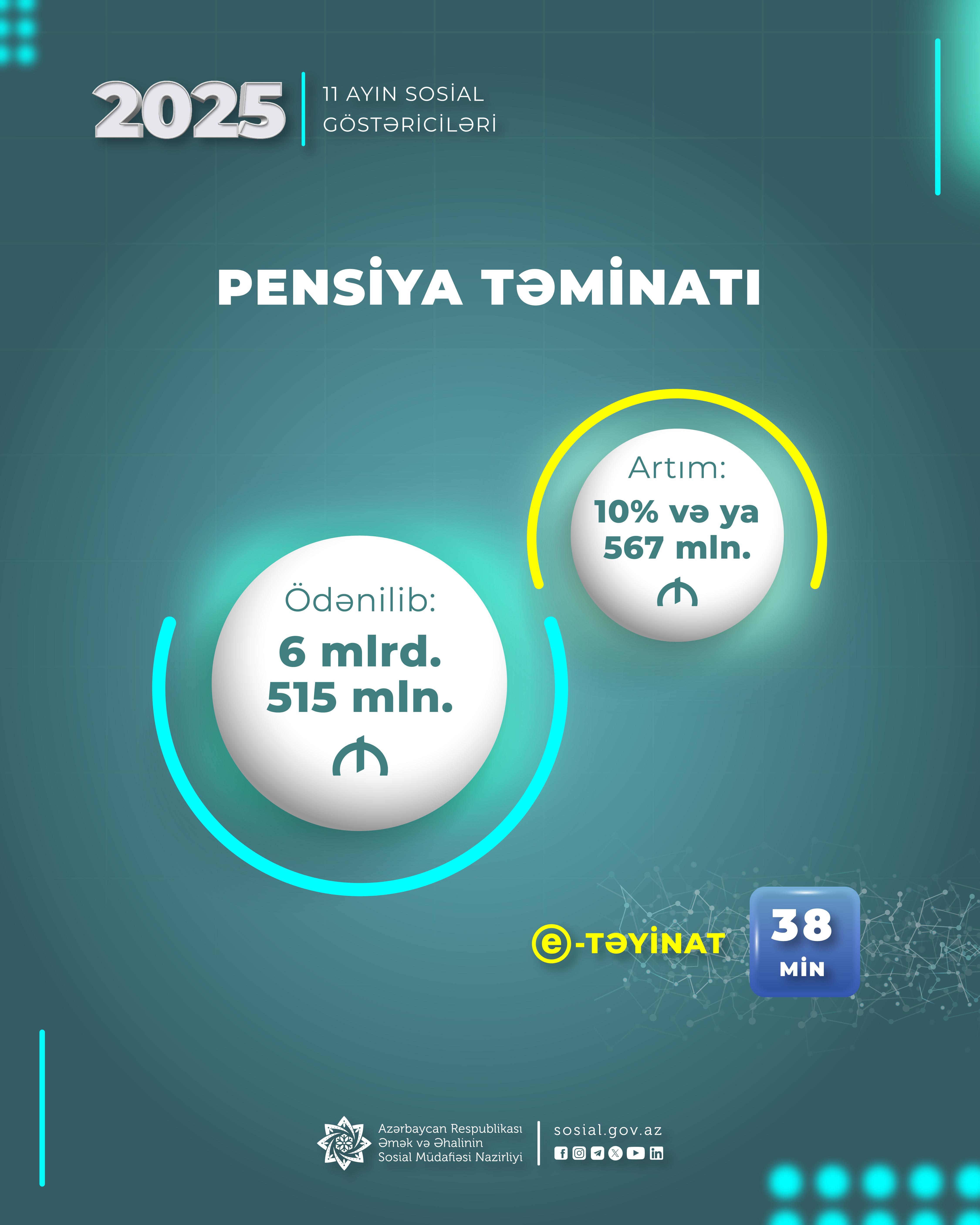 Bu ilin 11 ayında pensiya ödənişlərinə ötən ilin müvafiq dövrünə nisbətən 10 faiz (567 mln. manat) çox olmaqla 6 mlrd. 515 mln. manat vəsait yönəldilib.