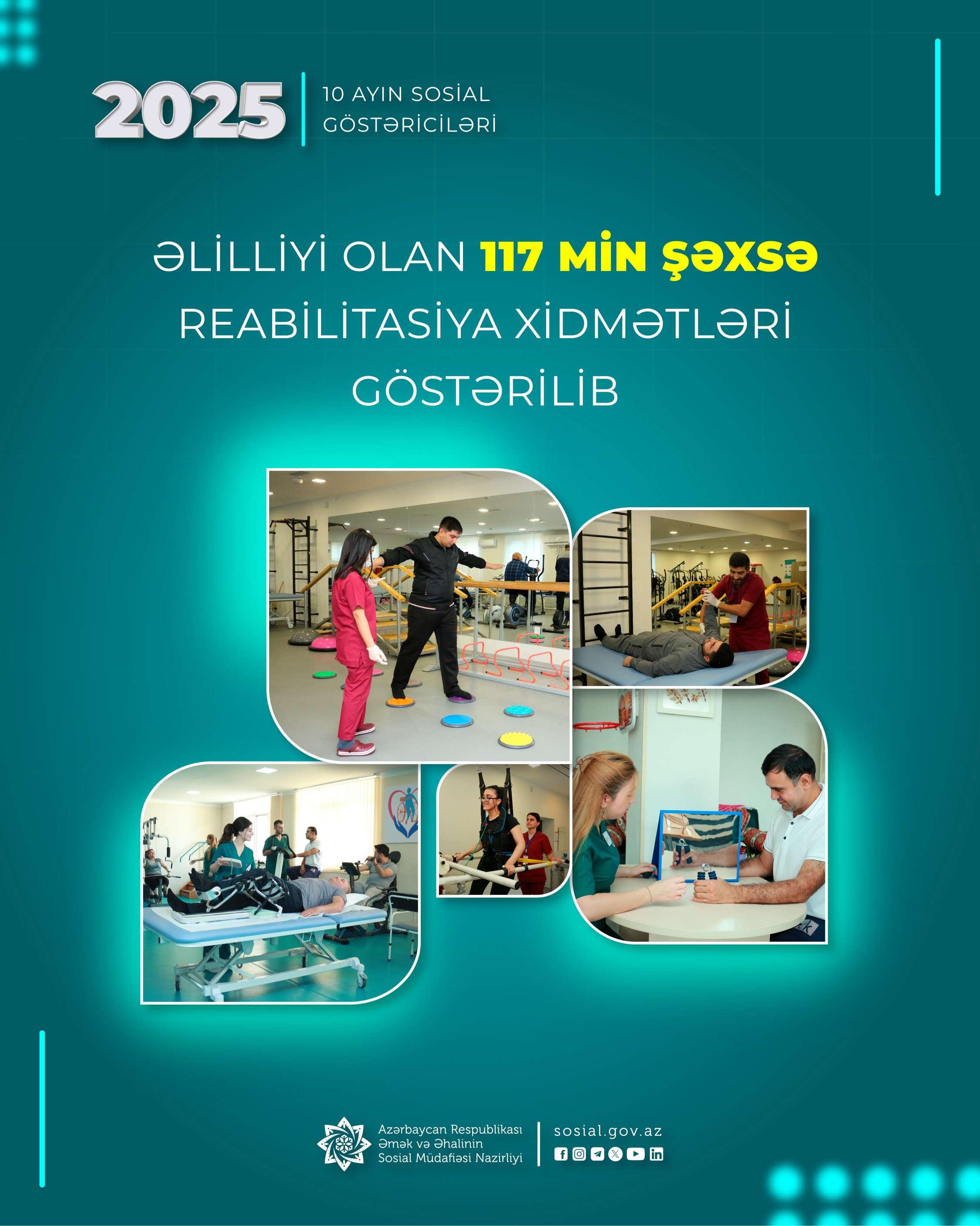 Əmək və Əhalinin Sosial Müdafiəsi Nazirliyinin tabeliyində Dövlət Tibbi-Sosial Ekspertiza və Reabilitasiya Agentliyi cari ilin yanvar-oktyabr aylarında əlilliyi olan 117 min şəxsi reabilitasiya xidmətləri ilə təmin edib.