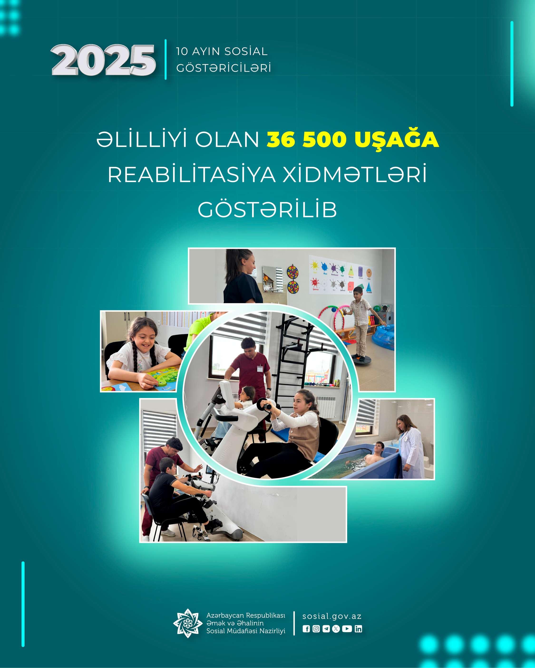 Əmək və Əhalinin Sosial Müdafiəsi Nazirliyinin tabeliyində Dövlət Tibbi-Sosial Ekspertiza və Reabilitasiya Agentliyinin uşaq reabilitasiya mərkəzlərində bu ilin yanvar-oktyabr aylarında əlilliyi olan 36,5 min uşağa xidmətlər göstərilib.