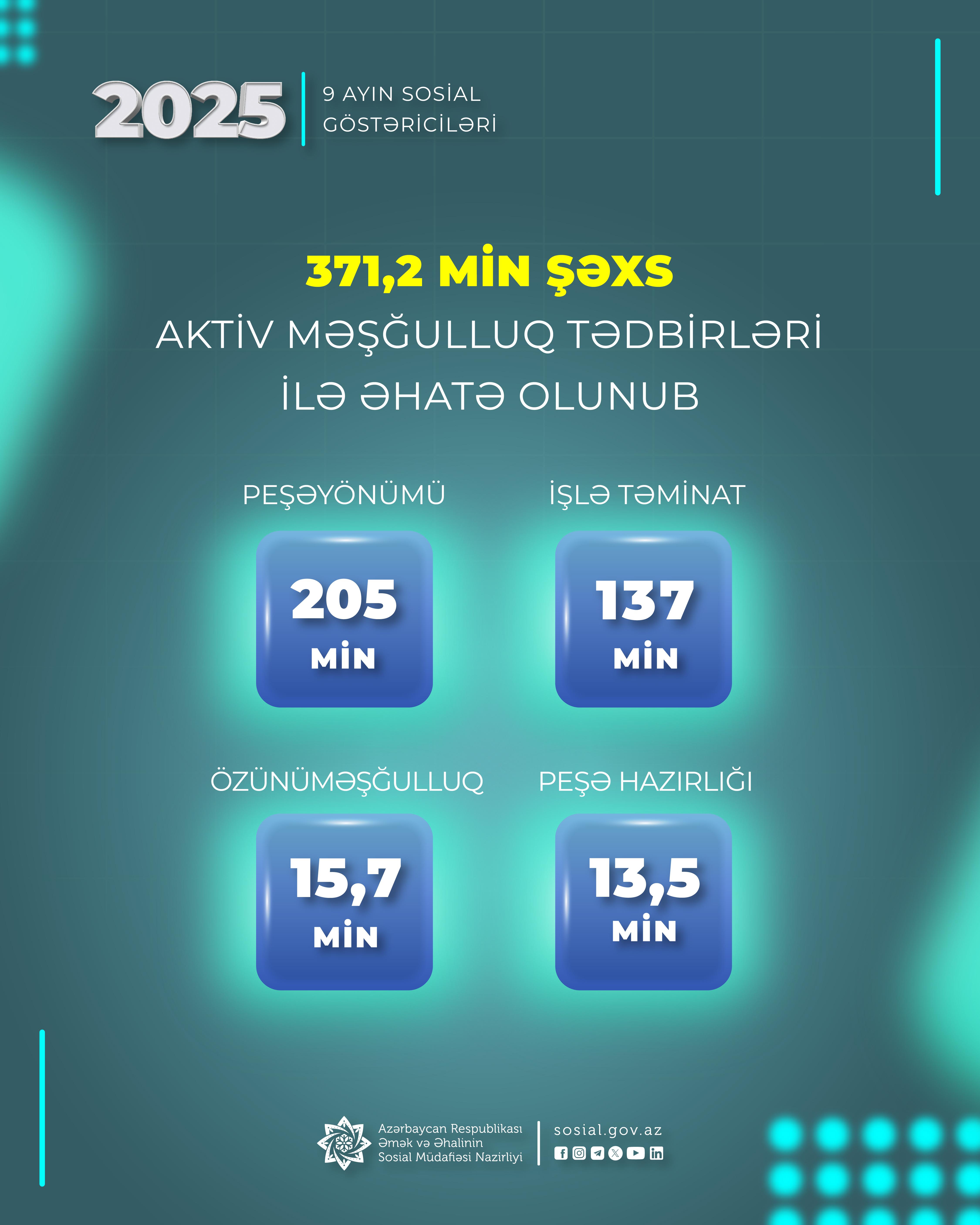 Yanvar-sentyabr aylarında 13,5 min işsiz şəxs üçün isə peşə hazırlığı kursları təşkil olunub, 205 min şəxsə peşəyönümü xidmətlər göstərilib.