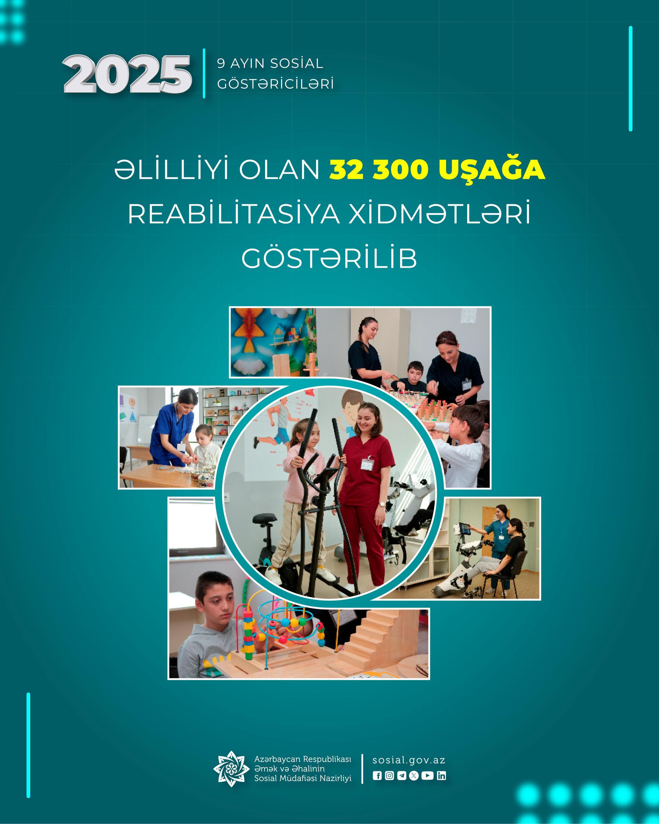 Əmək və Əhalinin Sosial Müdafiəsi Nazirliyinin tabeliyində Dövlət Tibbi-Sosial Ekspertiza və Reabilitasiya Agentliyinin uşaq reabilitasiya mərkəzlərində bu ilin yanvar-sentyabr aylarında əlilliyi olan 32300 uşağa xidmətlər göstərilib.