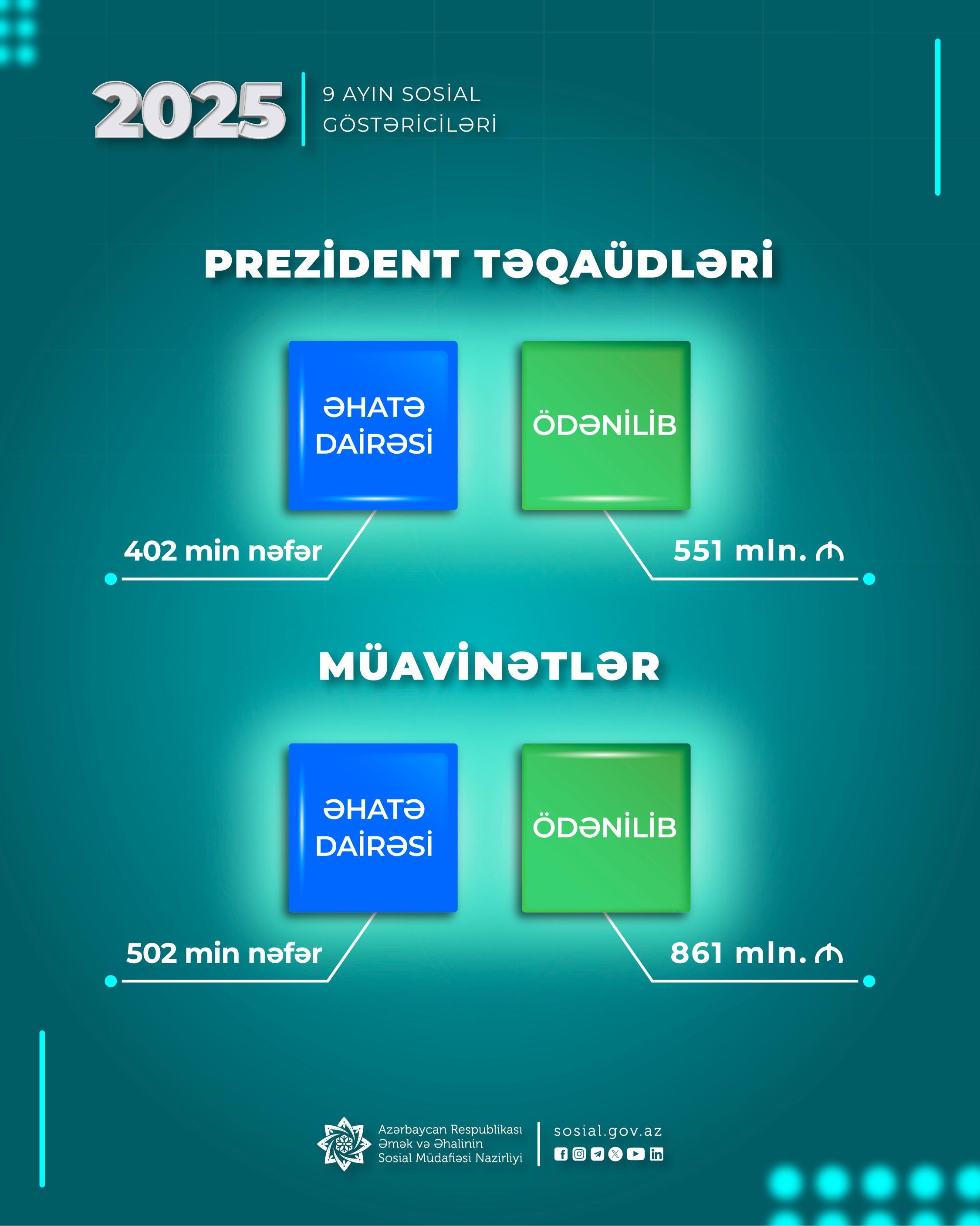 Həmin dövrdə əhaliyə sosial müavinətlər üzrə 861 mln. manat, Prezident təqaüdləri üzrə 551 mln. manat ödənilib.