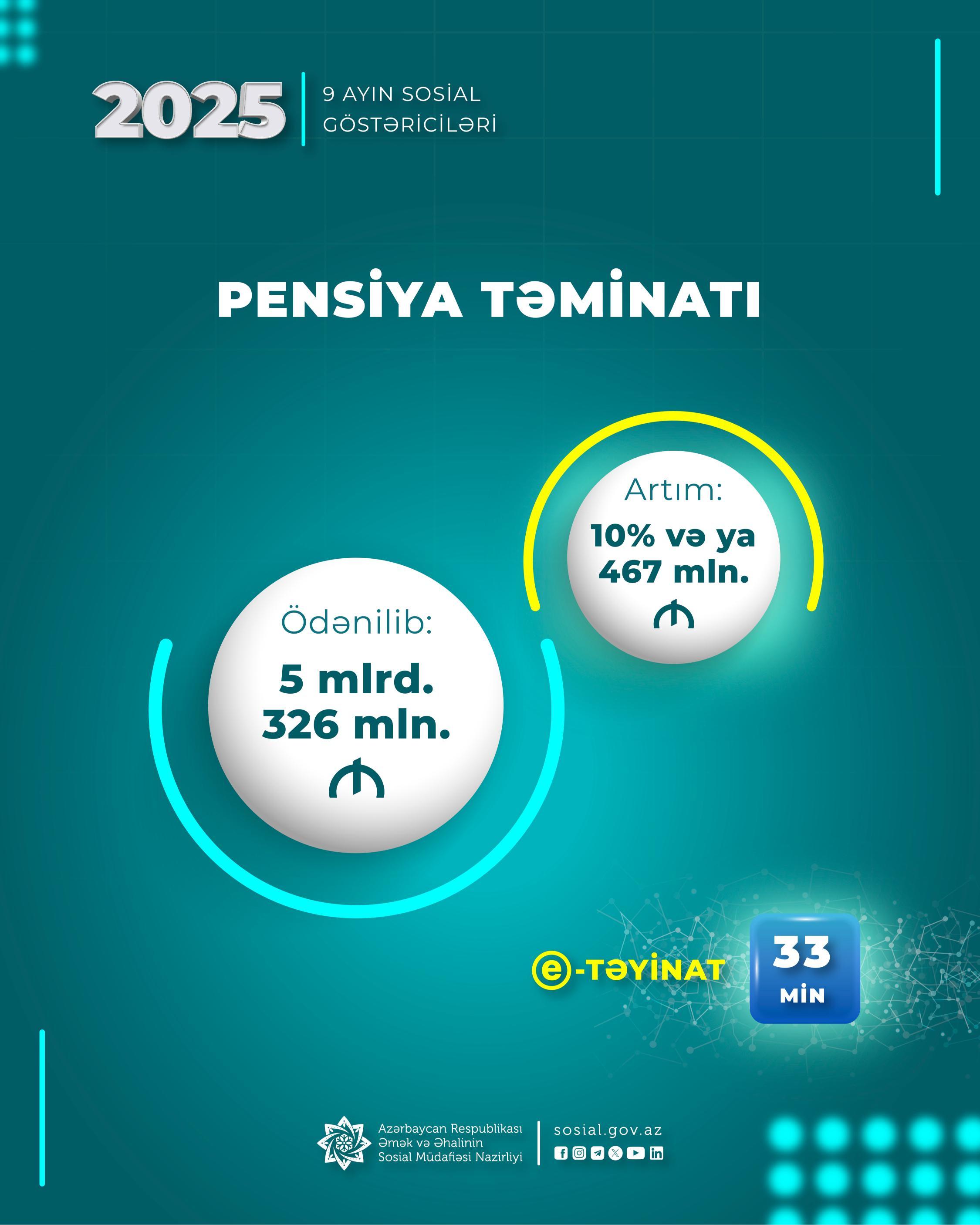 Bu ilin 9 ayında pensiya ödənişlərinə ötən ilin müvafiq dövrünə nisbətən 10 faiz (467 mln. manat) çox olmaqla 5 mlrd. 326 mln. manat vəsait yönəldilib.