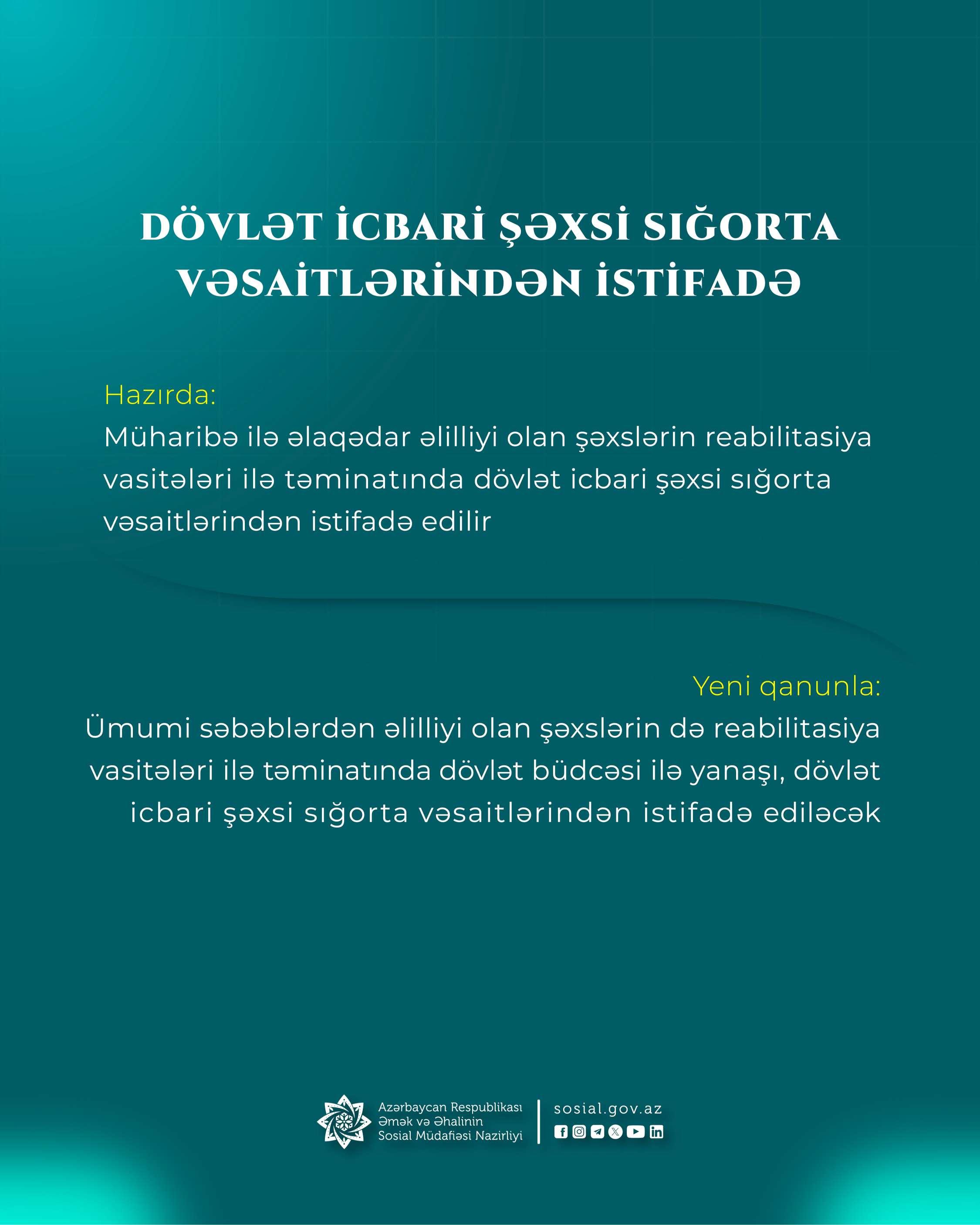 Ümumi səbəblərdən əlilliyi olan şəxslərin reabilitasiya vasitələri ilə təminatında dövlət icbari sığorta vəsaitindən də istifadə olunacaq