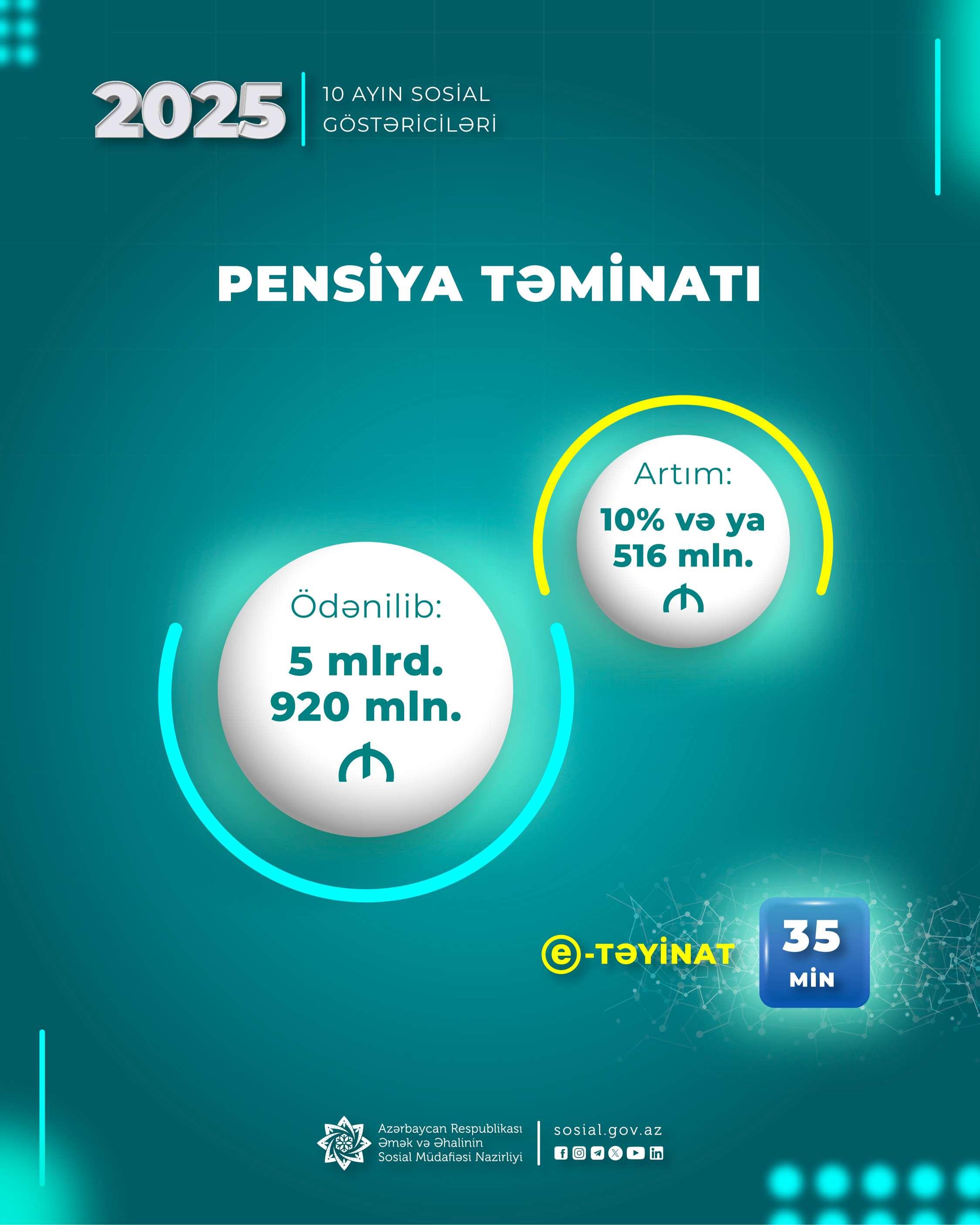 Yanvar-oktyabr aylarında pensiya ödənişlərinə 516 mln. manat çox olmaqla 5 mlrd. 920 mln. manat vəsait yönəldilib