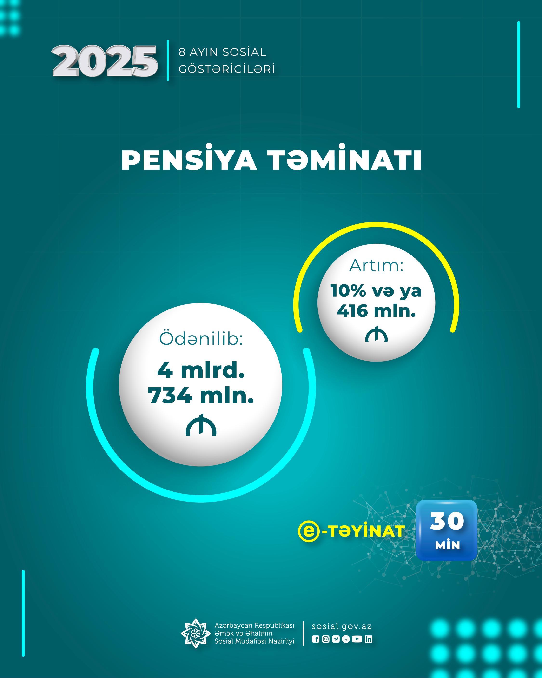 Yanvar-avqust aylarında pensiya ödənişlərinə 416 mln. manat çox olmaqla 4 mlrd. 734 mln. manat vəsait yönəldilib