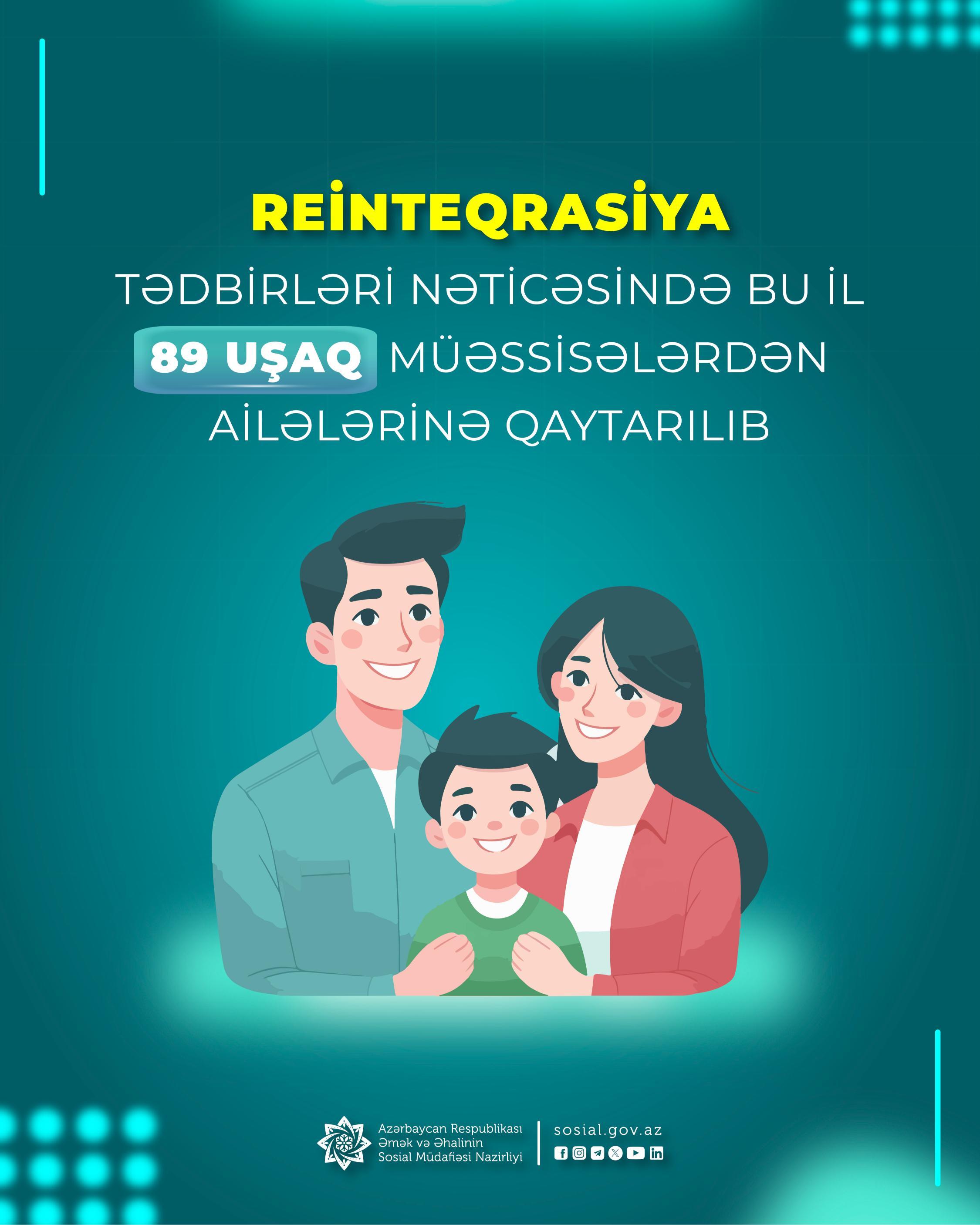 Reinteqrasiya tədbirləri nəticəsində bu il daha 89 uşaq müəssisələrdən ailələrinə qaytarılıb