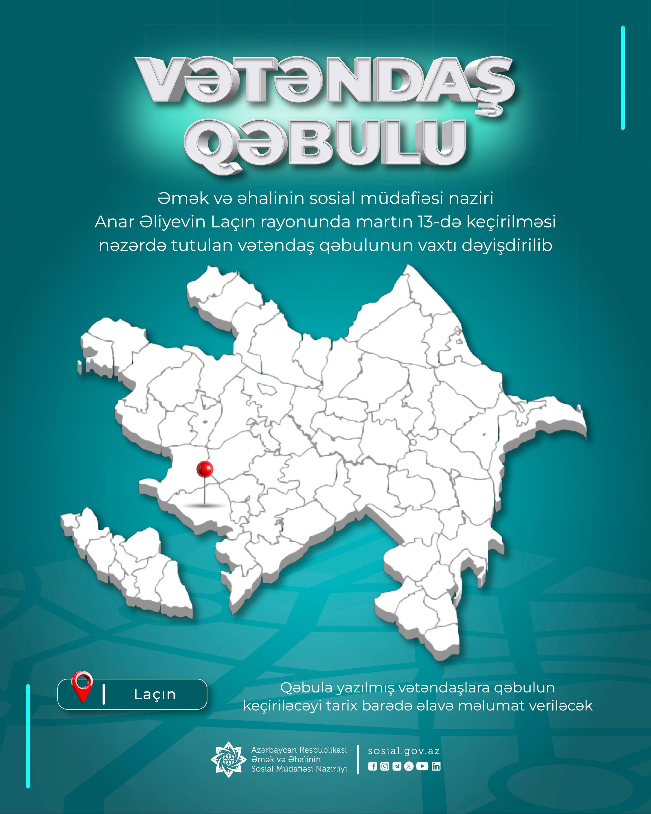 Nazir Anar Əliyevin Laçında keçirəcəyi vətəndaş qəbulunun vaxtı dəyişdirilib