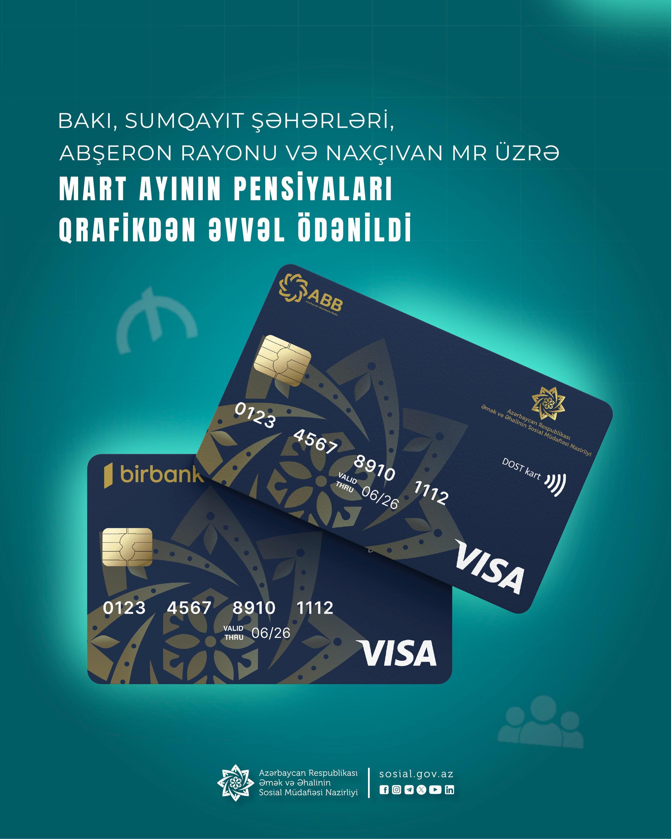 Bakı, Sumqayıt şəhərləri, Abşeron rayonu və Naxçıvan MR üzrə mart ayının pensiyaları qrafikdən əvvəl ödənildi